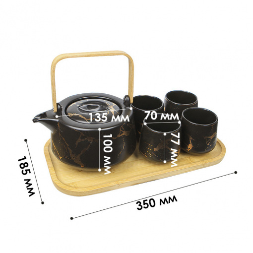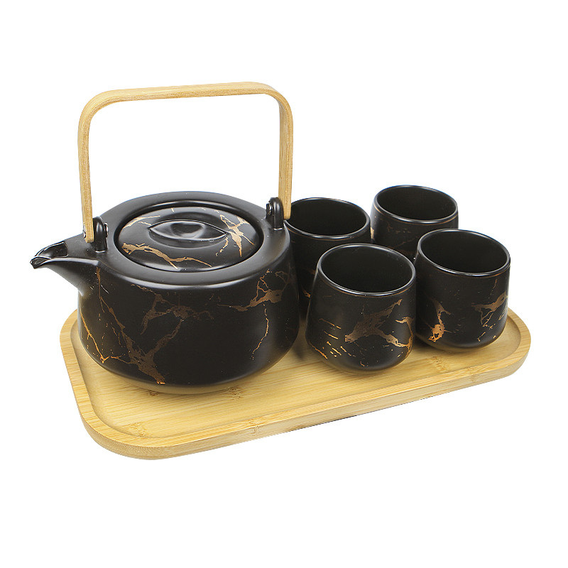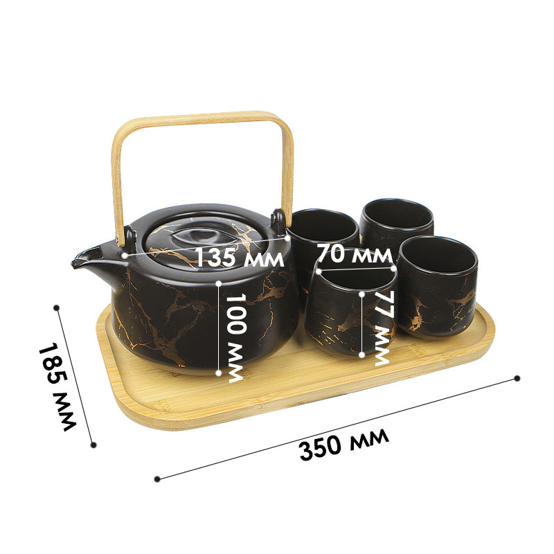 Чайный сервиз No Brand Мраморная роскошь Black чайник 4 чашки с деревянной подставкой