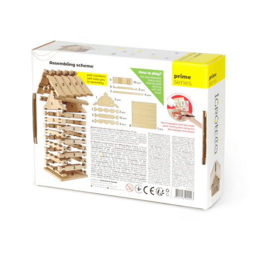 Еко іграшка конструктор «Скарбничка» призначений для діток від 4-х років, дозволить Вашій дитині побудувати своїми руками скарбничку для кишенькових грошей! Ззовні зібрана фігура нагадує невеличку хатинку, дашки якої сходяться не до кінця і утворюється отвір, куди можна кидати монети та паперові гроші. А коли вона наповниться монетами, просто розбери конструктор та склади його заново! При бажанні малюк може склеїти Скарбничку клеєм ПВА та розмалювати її на свій смак. Наліпки, стрази, розпис чи декупаж іграшки зроблять її особливою та індивідуальною. Гра з конструктором це: розвиваюча еко іграшка, безпечна для дитини і природи розвиток логіки, мислення тренування дрібної моторики, сенсорики, окоміру навчання працювати за схемою, слідувати інструкції така гра виховує цілеспрямованість, посидючість, послідовність в діях Увага! Як і справжні будинки, наші конструктори радимо починати складати з фундаменту! На рівній твердій поверхні викладіть найнижчий рівень, а потім рівень за рівнем, брус за брусом зводьте стіни, перекладайте деталі паз-в-паз, кріпіть їх, робіть перемички, з’єднуйте прибудови і накривайте дахом! Конструктор виготовлений з натуальної цільної деревини. Висота Скарбнички 13 см