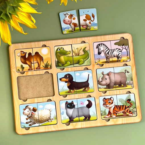 Дев'ять картинок-половинок тварин, які необхідно зібрати на планшеті. Половинки взаємозамінні, можна зібрати не тільки "зебру", але і "кроко-зебру". Деталі зручно діставати пальчиками.
