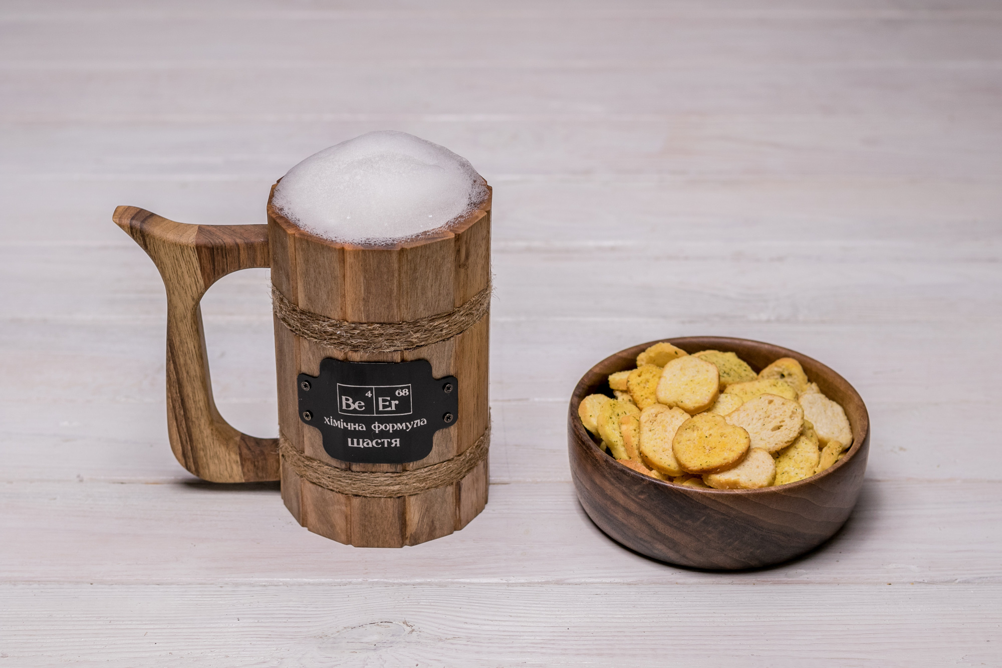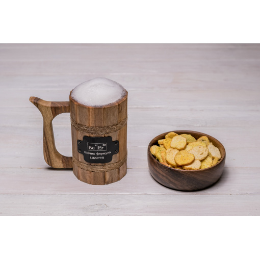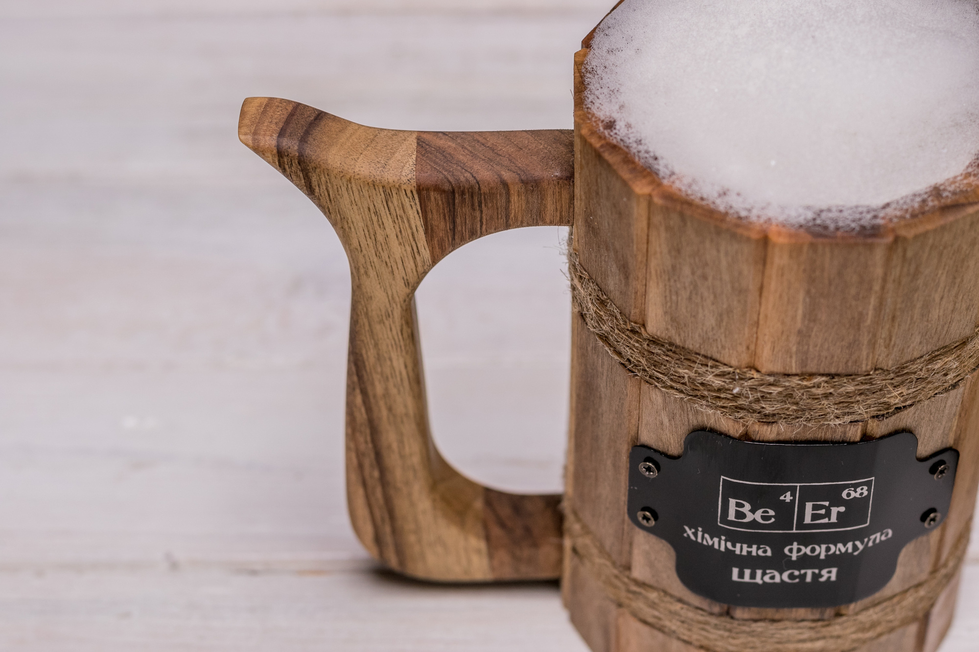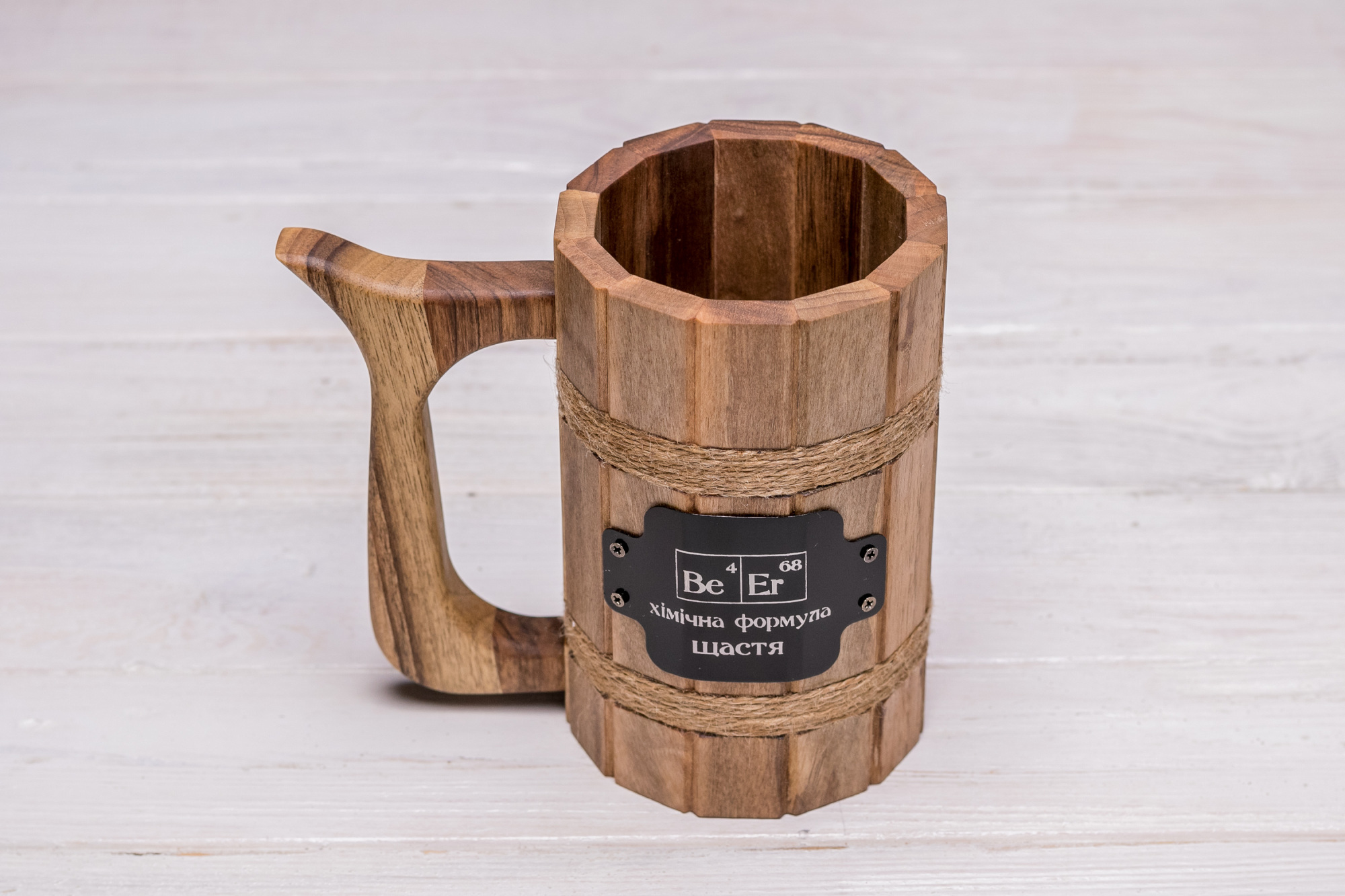 Деревянный сегментный (состоит из сегментов, ручки и дна) бокал EcoWalnut цилиндрической формы для холодных напитков с металлической бляхой. При употреблении хмельных напитков из деревянного бокала (в отличии от стеклянного) пенка не падает очень длительный период времени. Стук деревянного бокала несомненно куда более приятен и процесс распития пива превращается в веселую и легендарную затею. Кроме этого - бокал невозможно разбить.