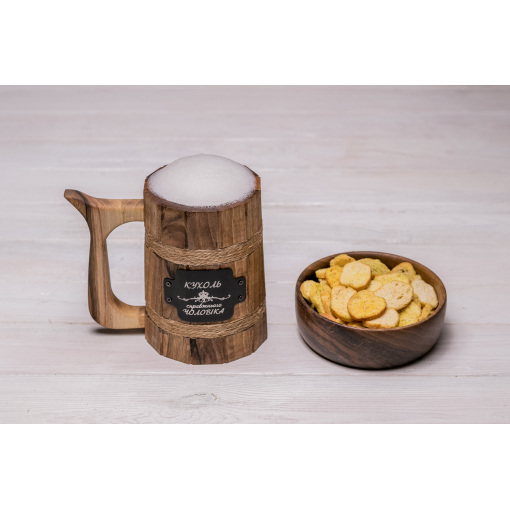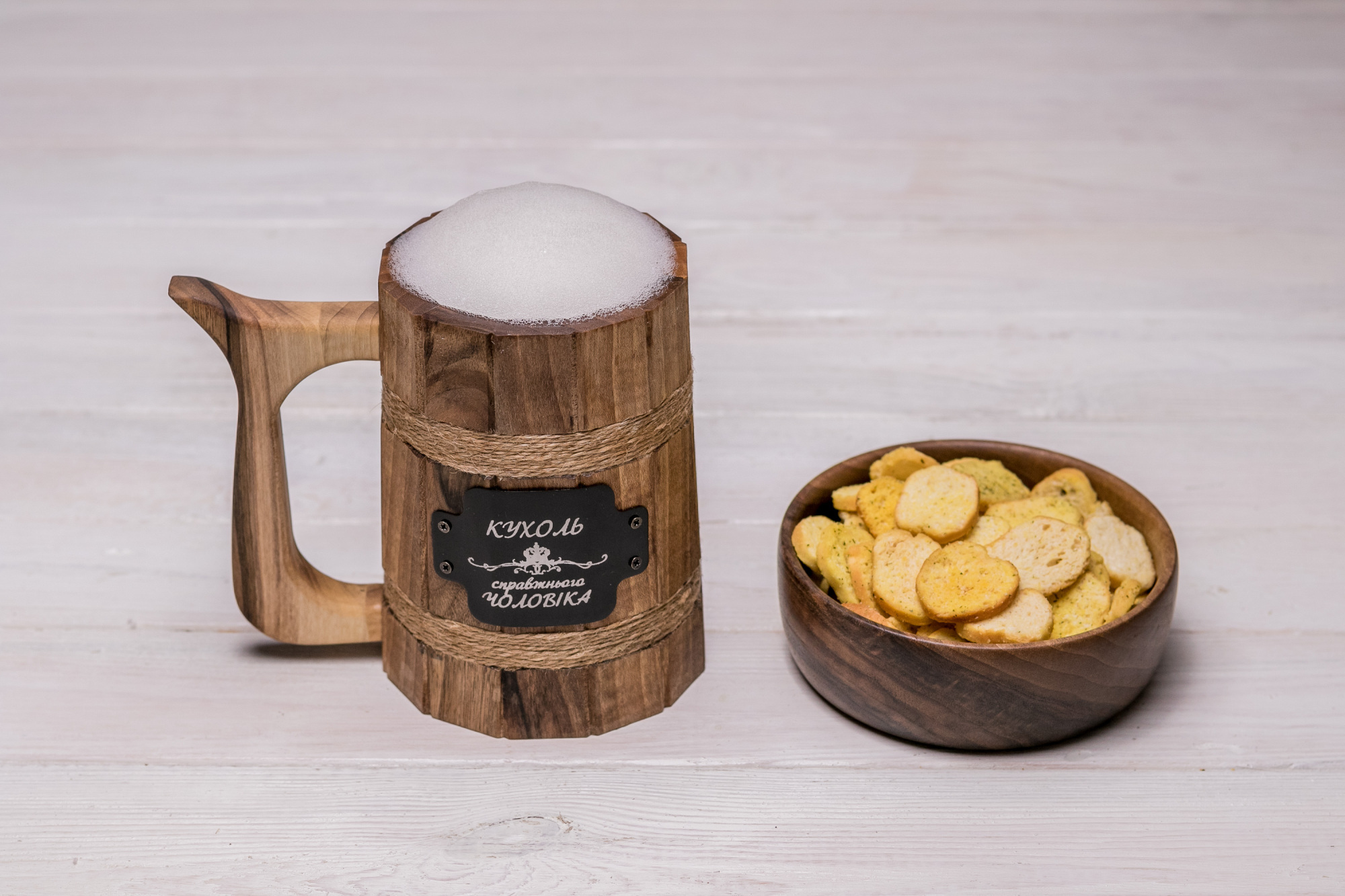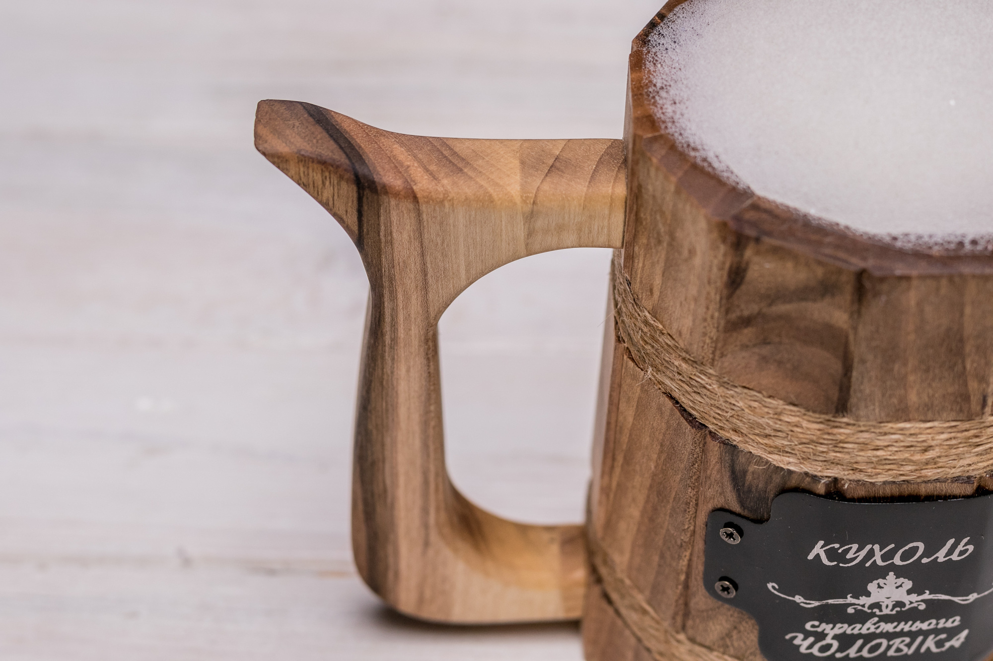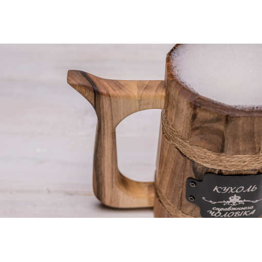 Деревянный сегментный (состоит из сегментов, ручки и дна) бокал EcoWalnut конусной формы для холодных напитков с металлической бляхой. При употреблении хмельных напитков из деревянного бокала (в отличии от стеклянного) пенка не падает очень длительный период времени. Стук деревянного бокала несомненно куда более приятен и процесс распития пива превращается в веселую и легендарную затею. Кроме этого - бокал невозможно разбить.