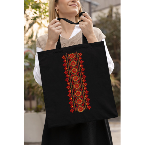 Эко-сумка шоппер с патриотическим принтом "Украинский желто-красный вертикальный орнамент" Кавун черный