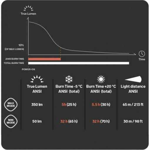 • Максимальный световой поток: 350 люмен, дальность 65 м, время работы 5-5,5 часов