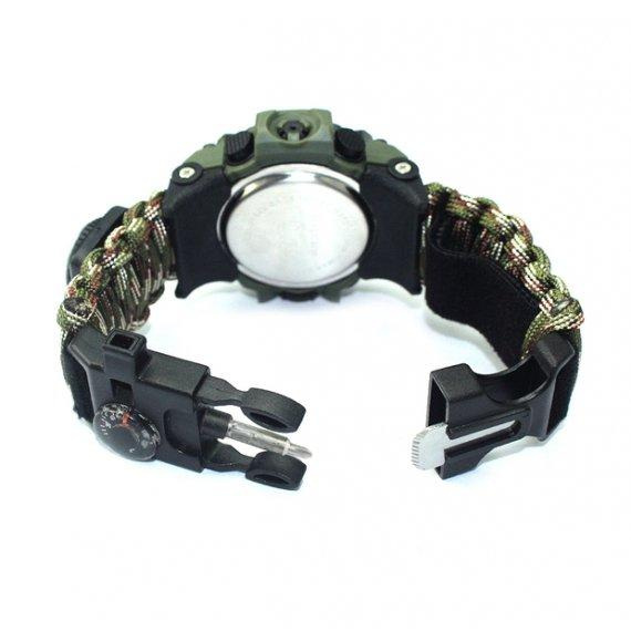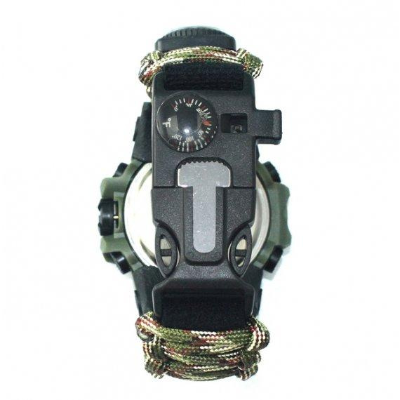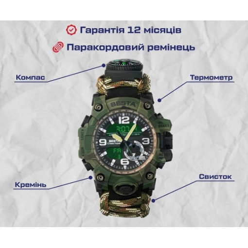 • Функції - Компас, будильник, секундомір, подвійний час, термометр, тактична застібка, підсвічування, 2 батареї