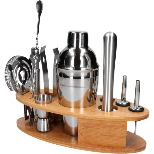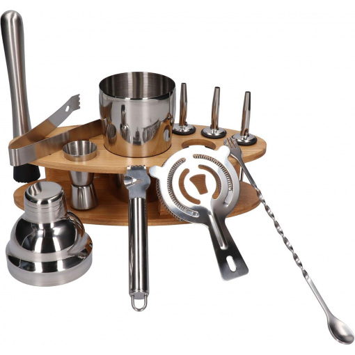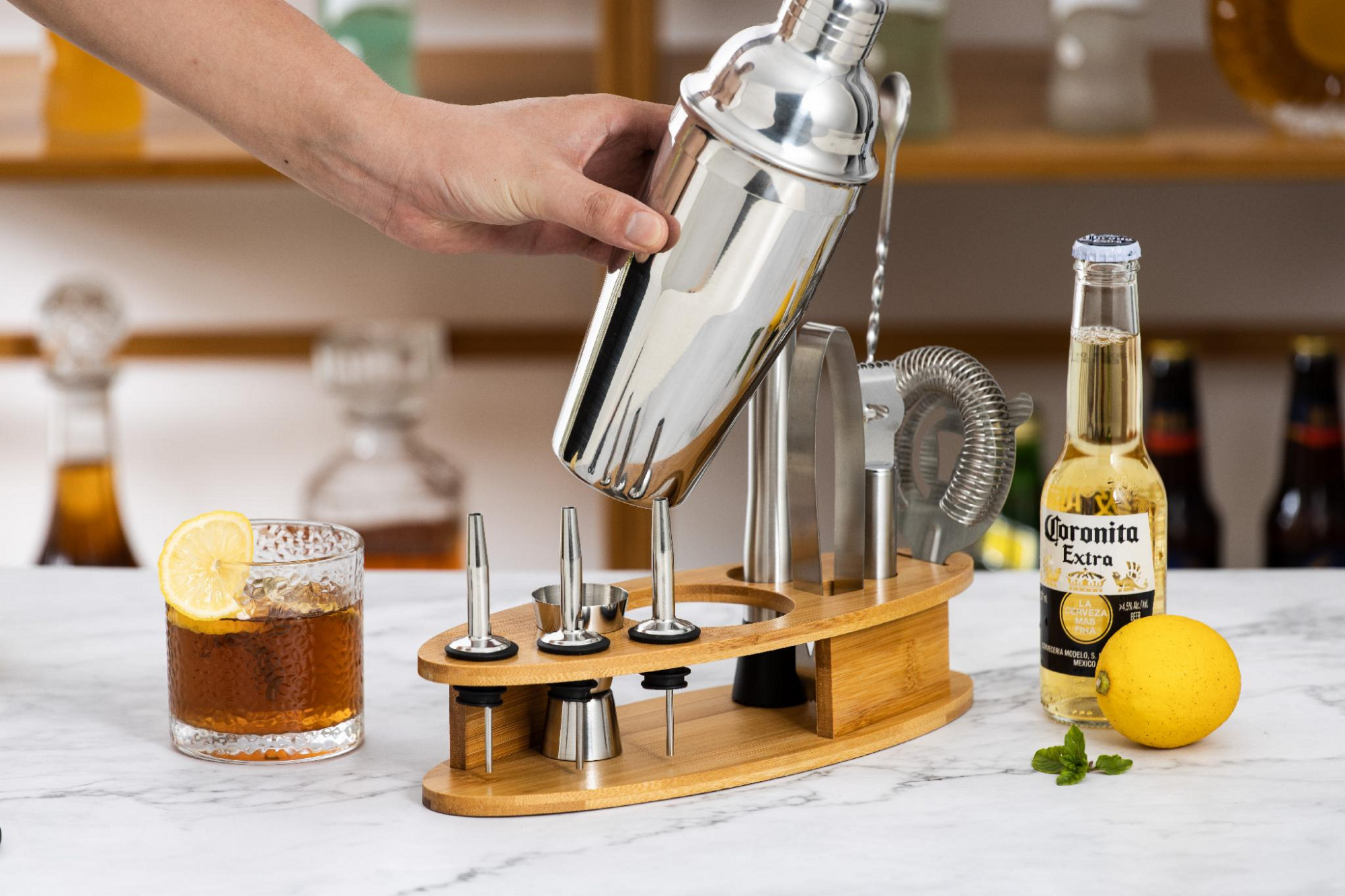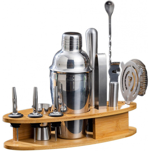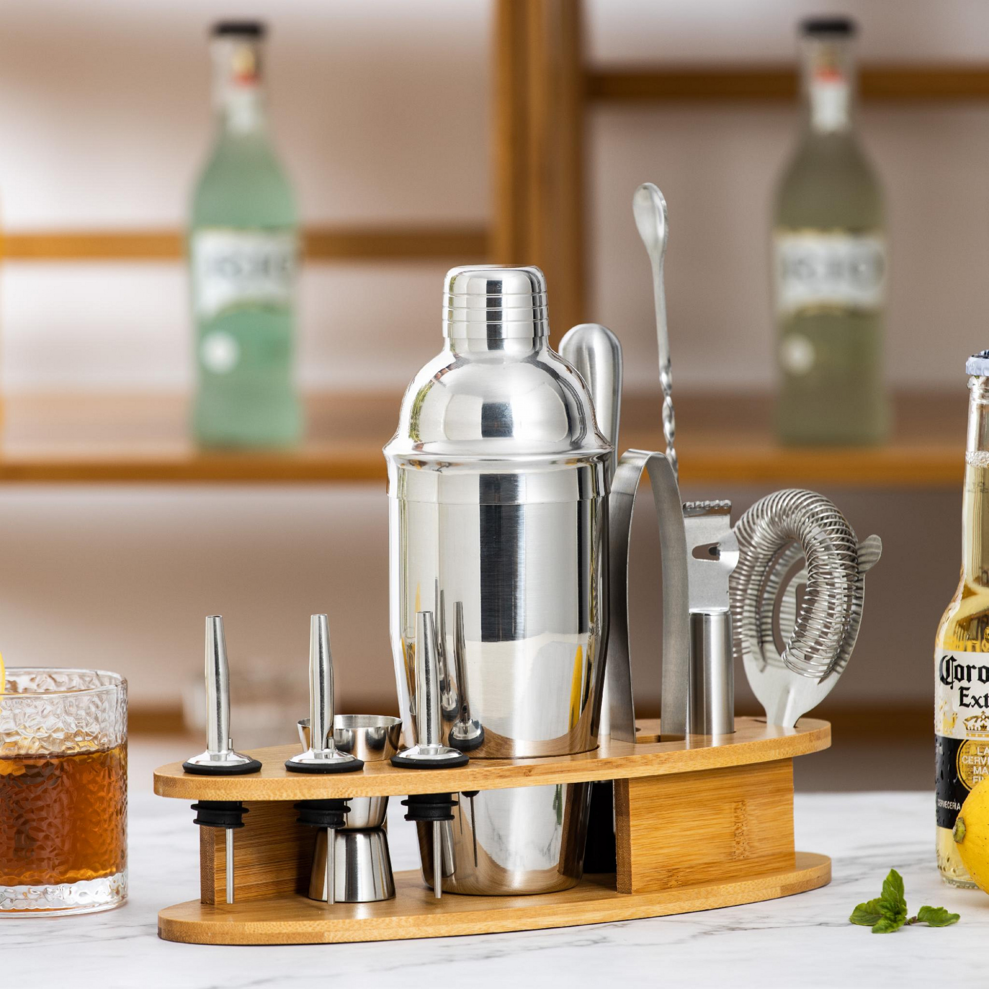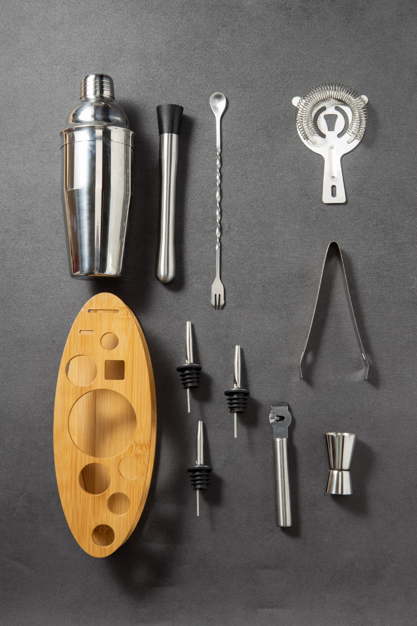 Набор для бара 11 в 1 для приготовления коктейлей изготовлен из высококачественной нержавеющей стали и имеет подставку.