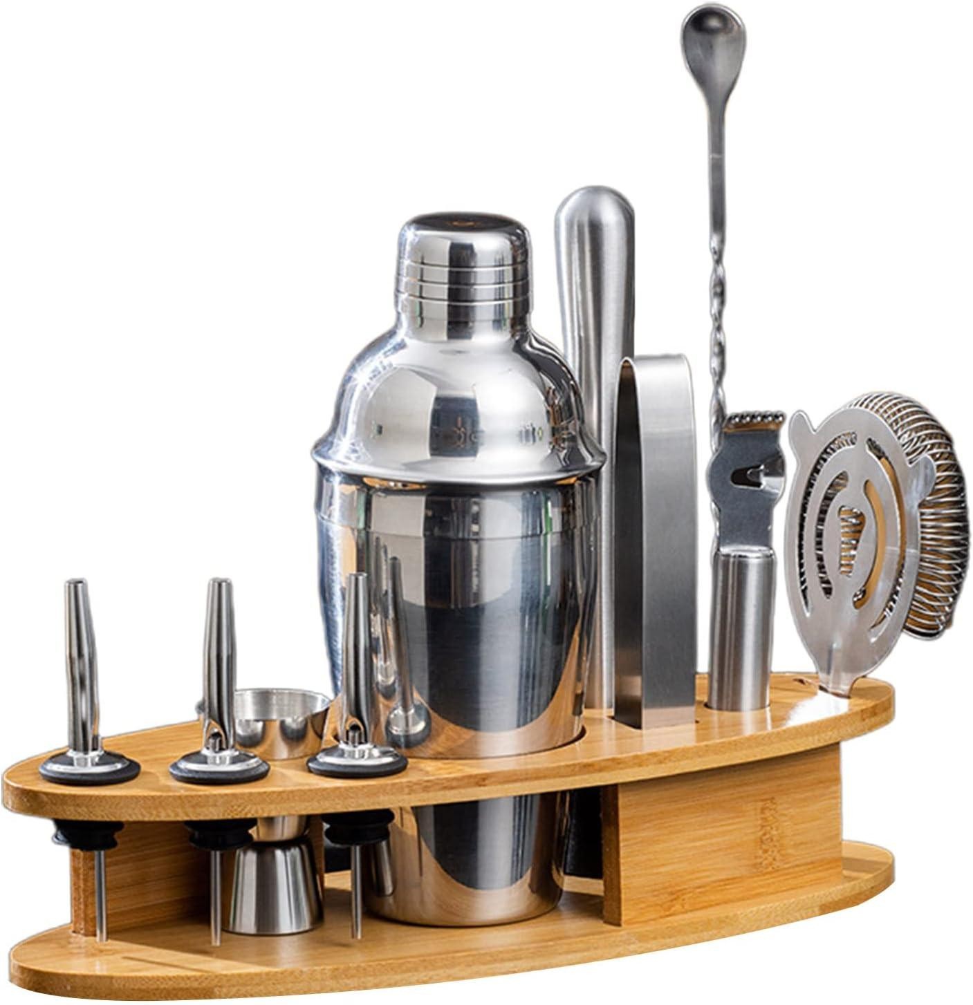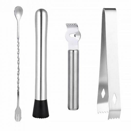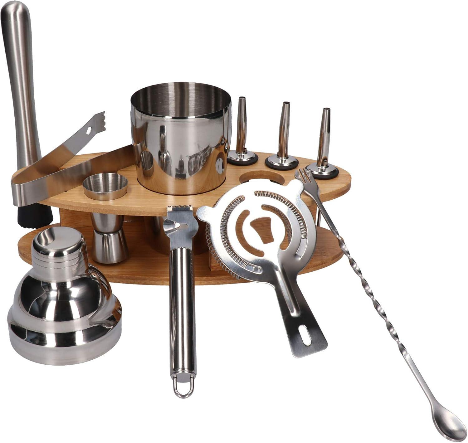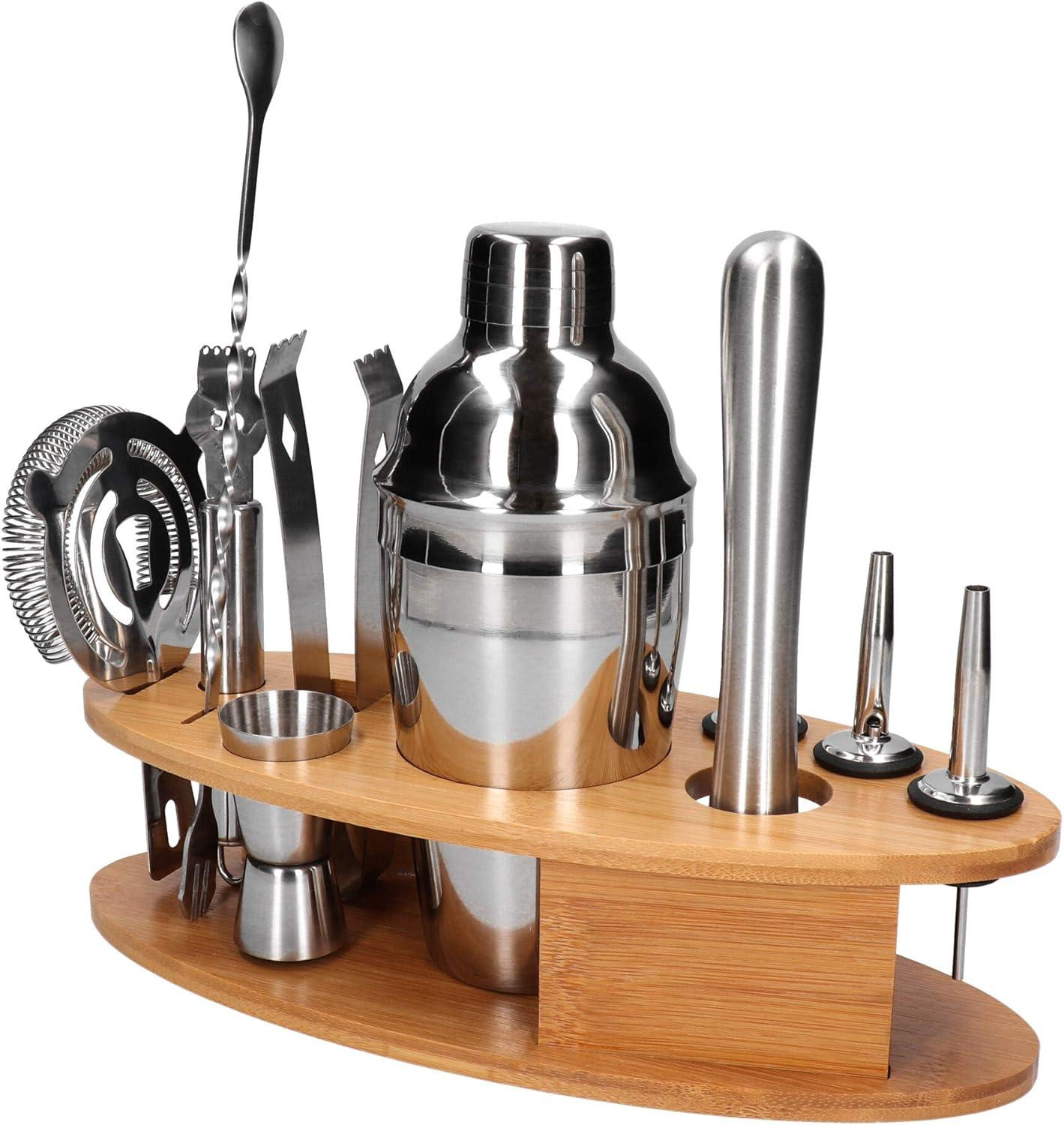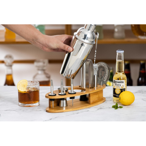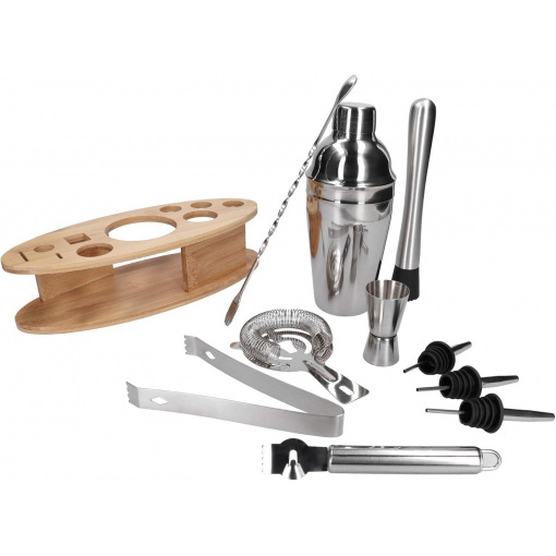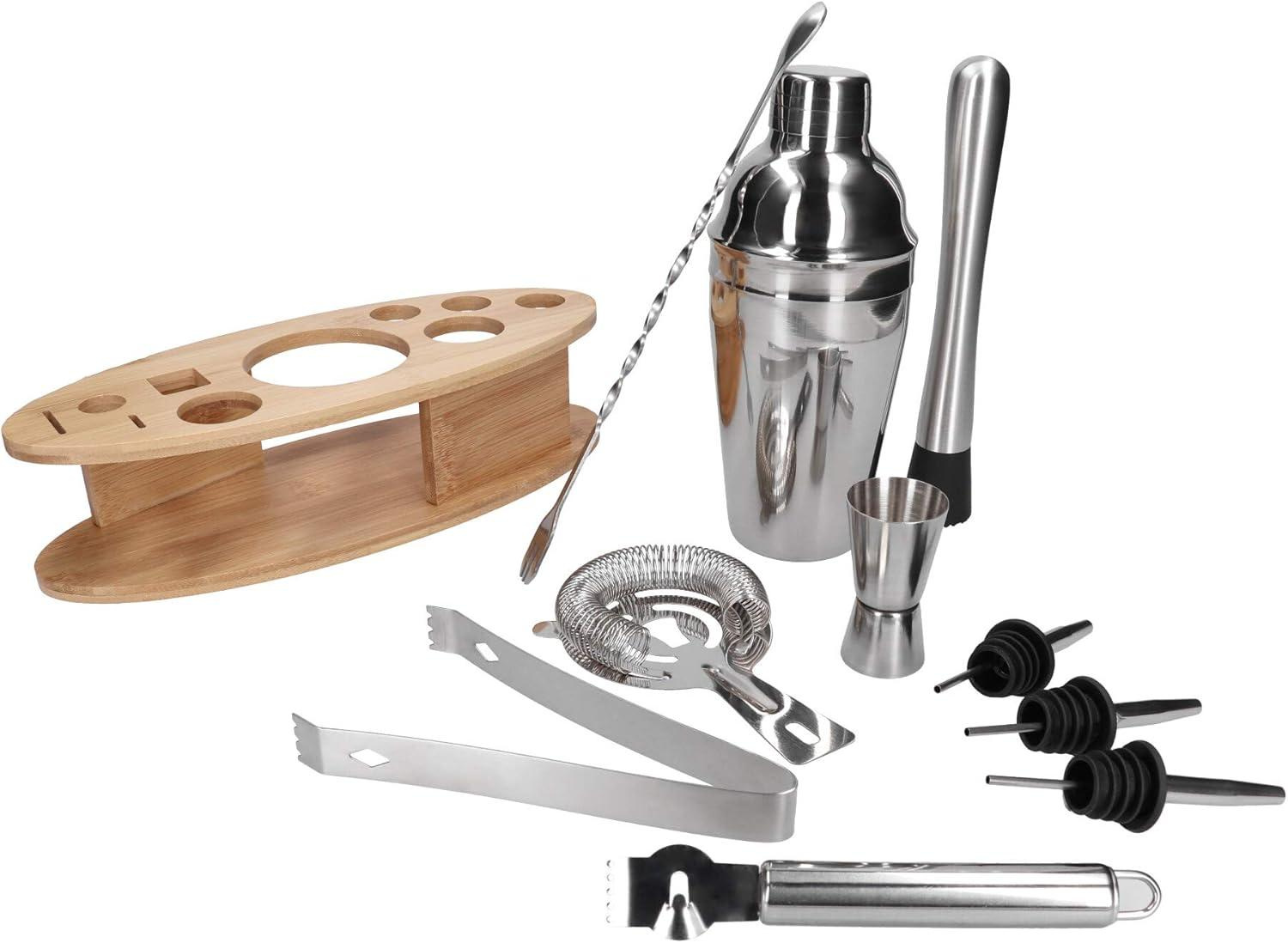 Набор для бара 11 в 1 для приготовления коктейлей изготовлен из высококачественной нержавеющей стали и имеет подставку.