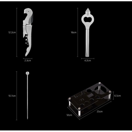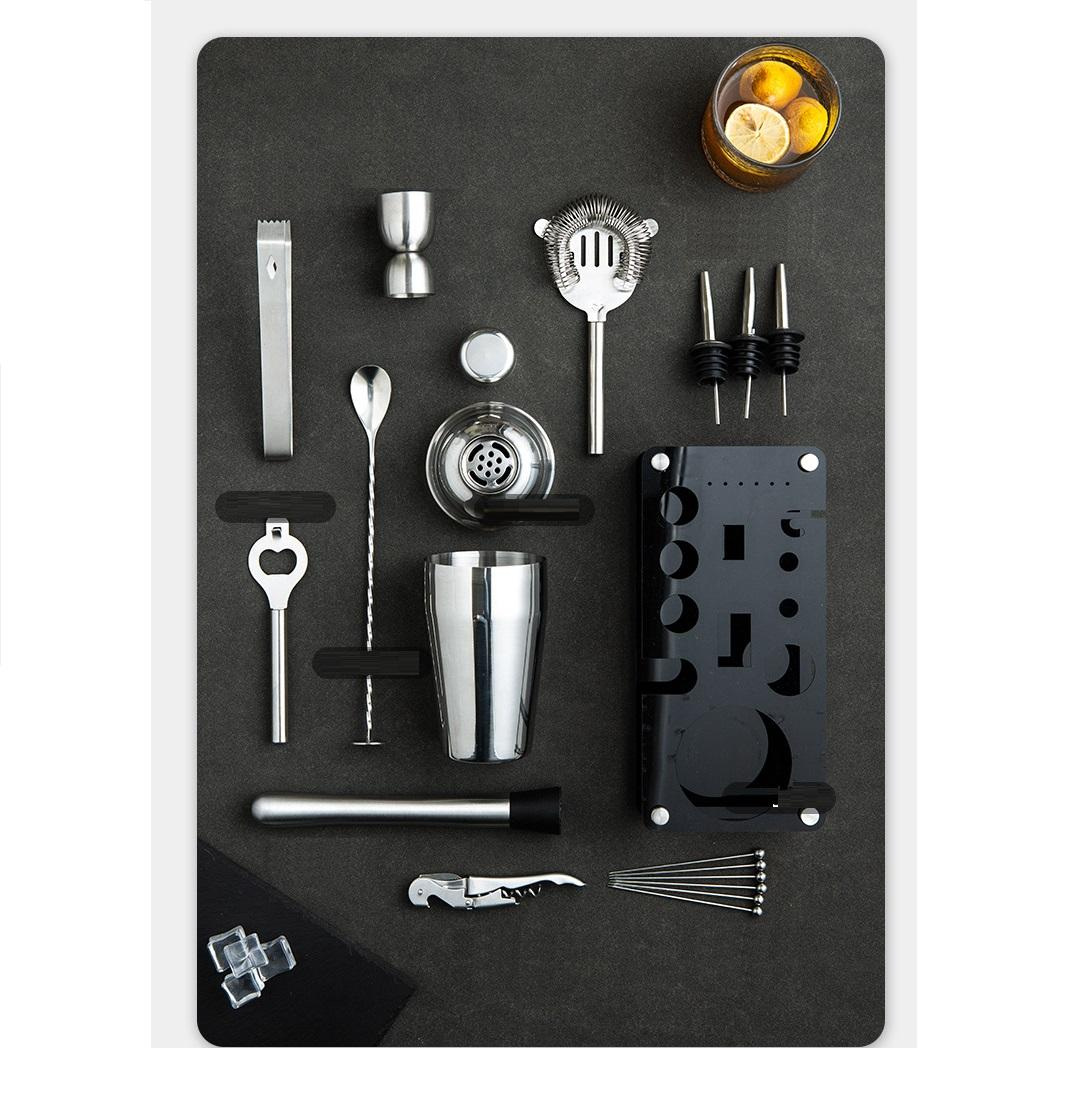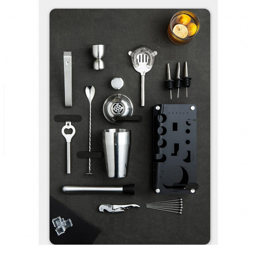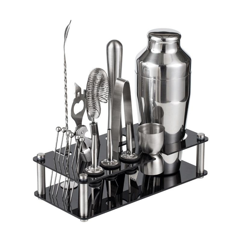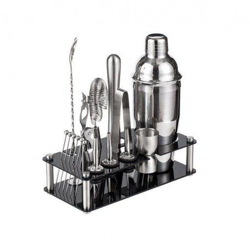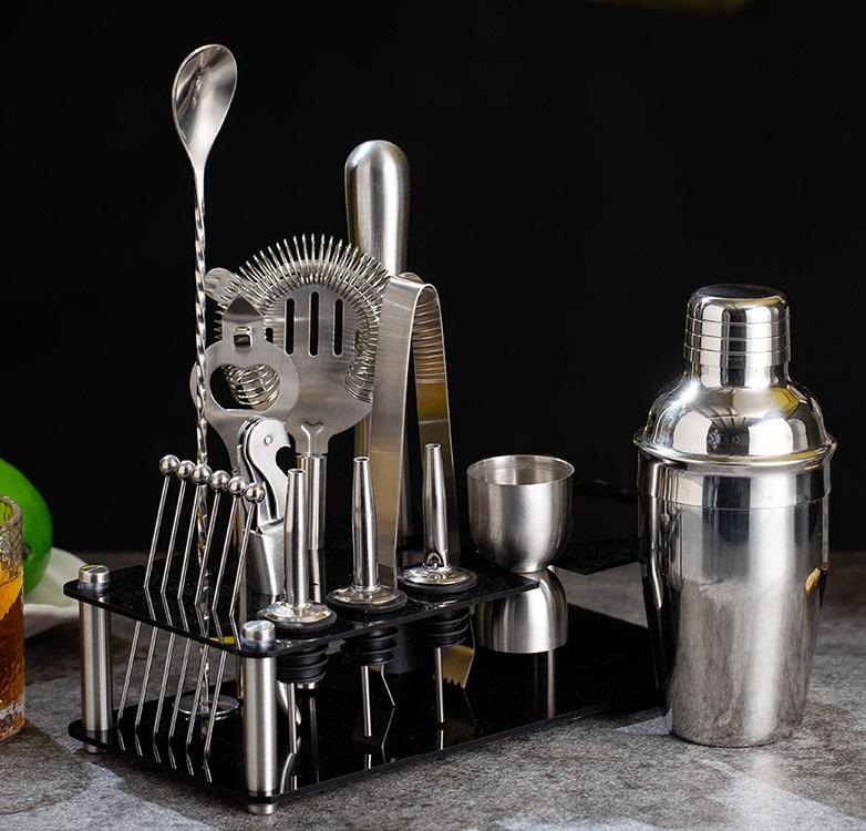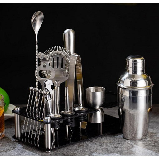 Набор для бара 17 в 1 для приготовления коктейлей изготовлен из высококачественной нержавеющей стали и имеет подставку.