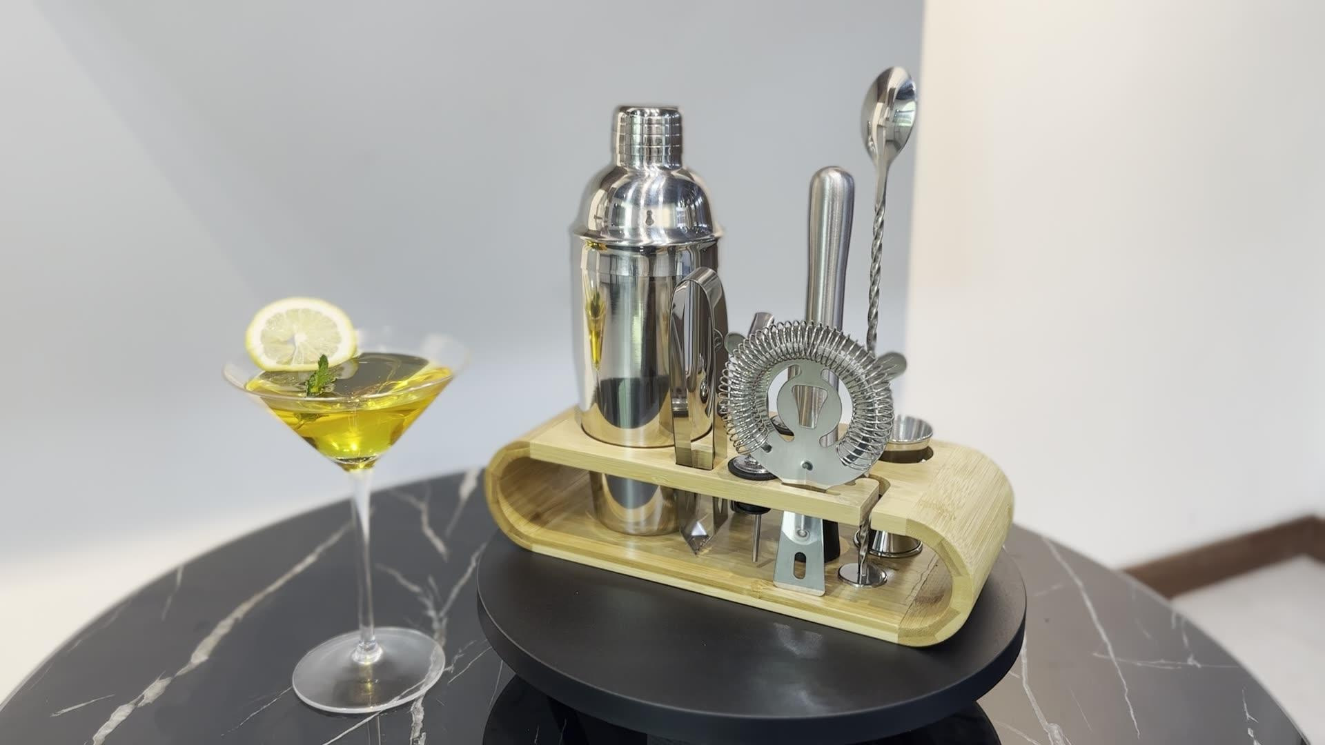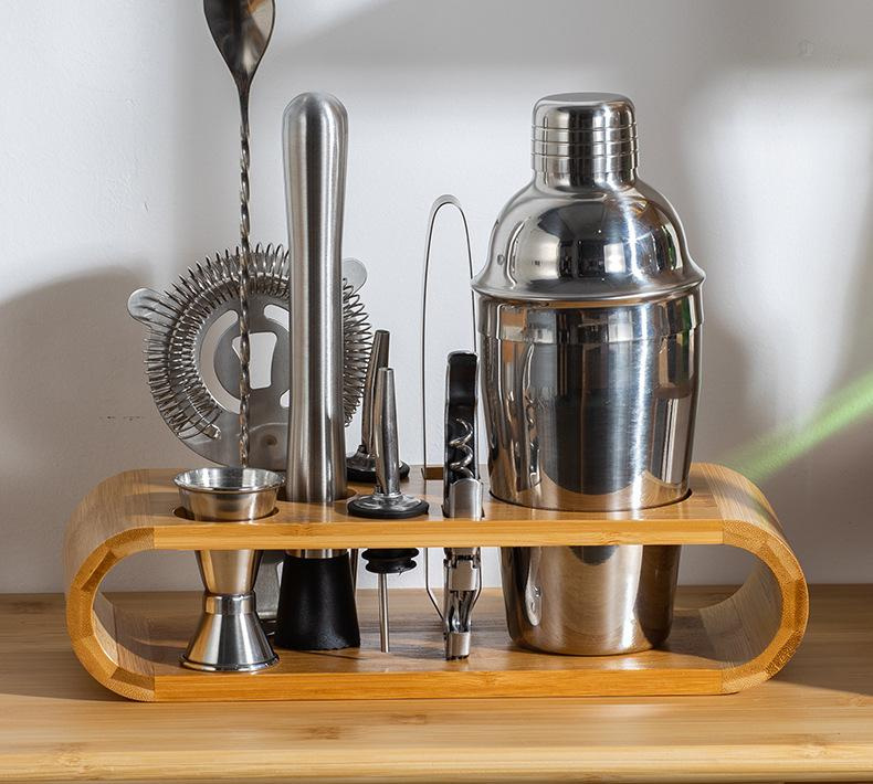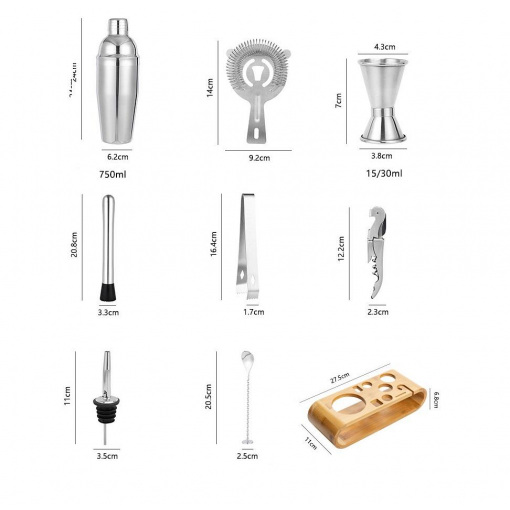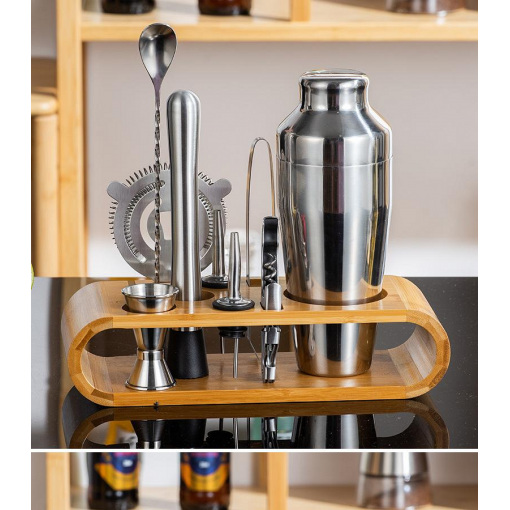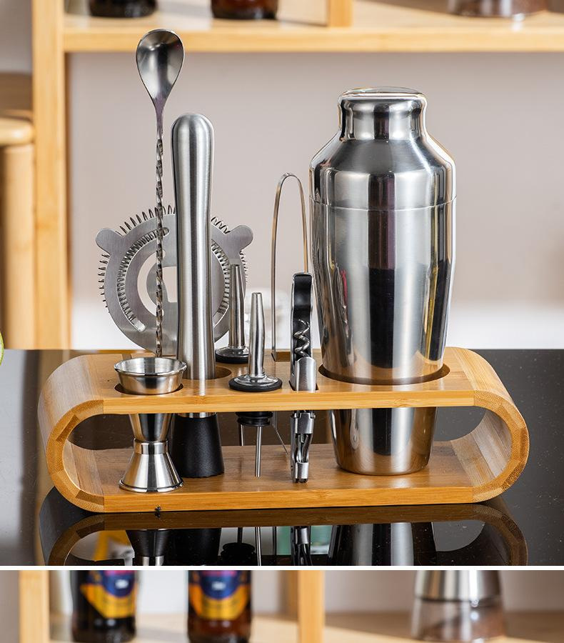 Набор для бара 10 в 1 для приготовления коктейлей изготовлен из высококачественной нержавеющей стали и имеет деревянную подставку.