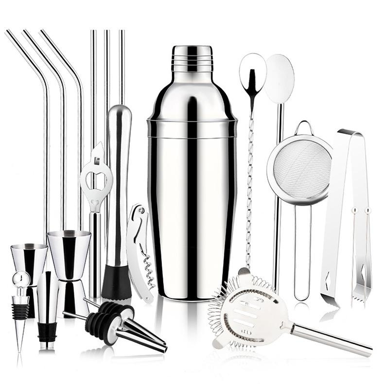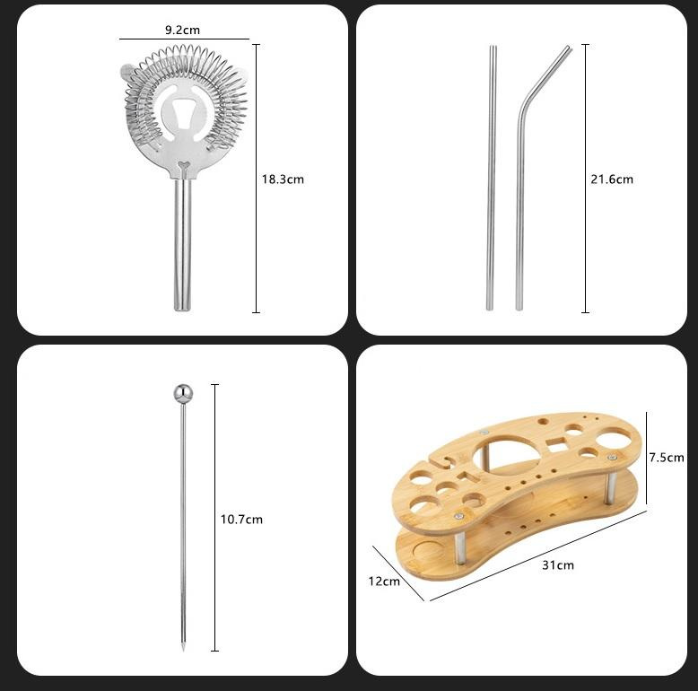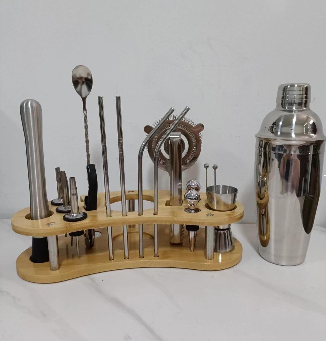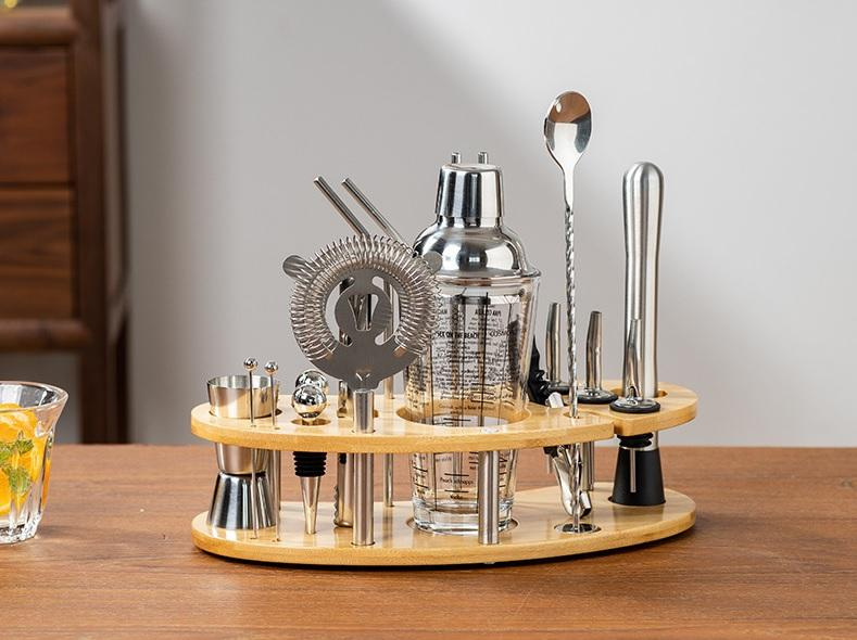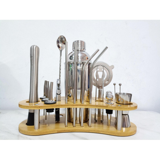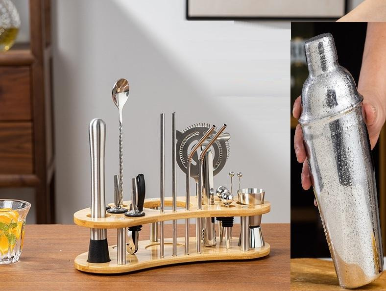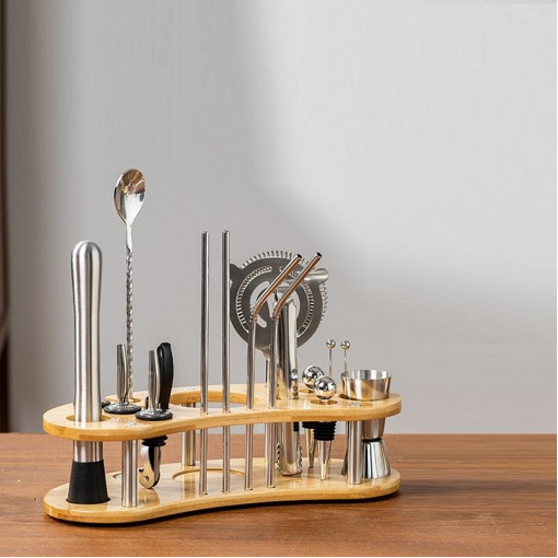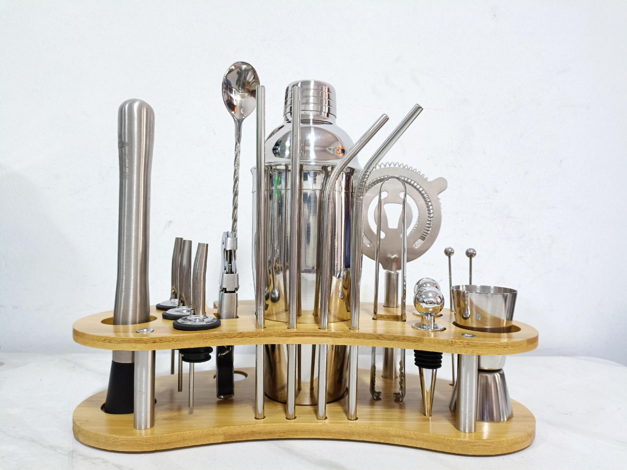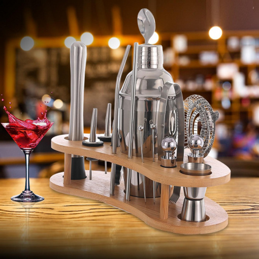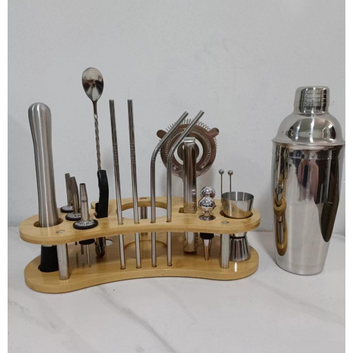 Набор для бара 19 в 1 для приготовления коктейлей изготовлен из высококачественной нержавеющей стали и имеет подставку.