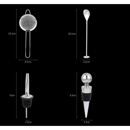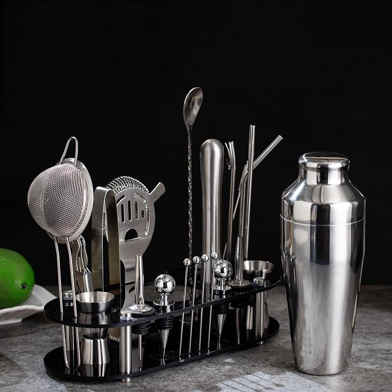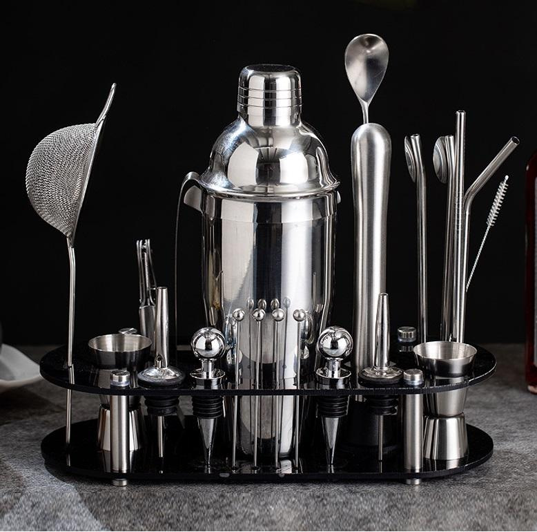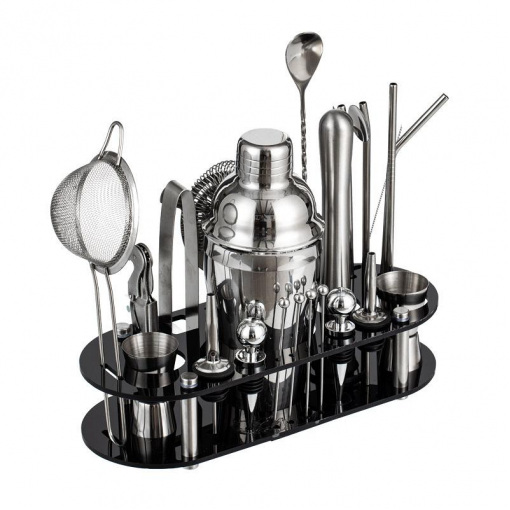 Набор для бара 23 в 1 для приготовления коктейлей изготовлен из высококачественной нержавеющей стали и имеет подставку.