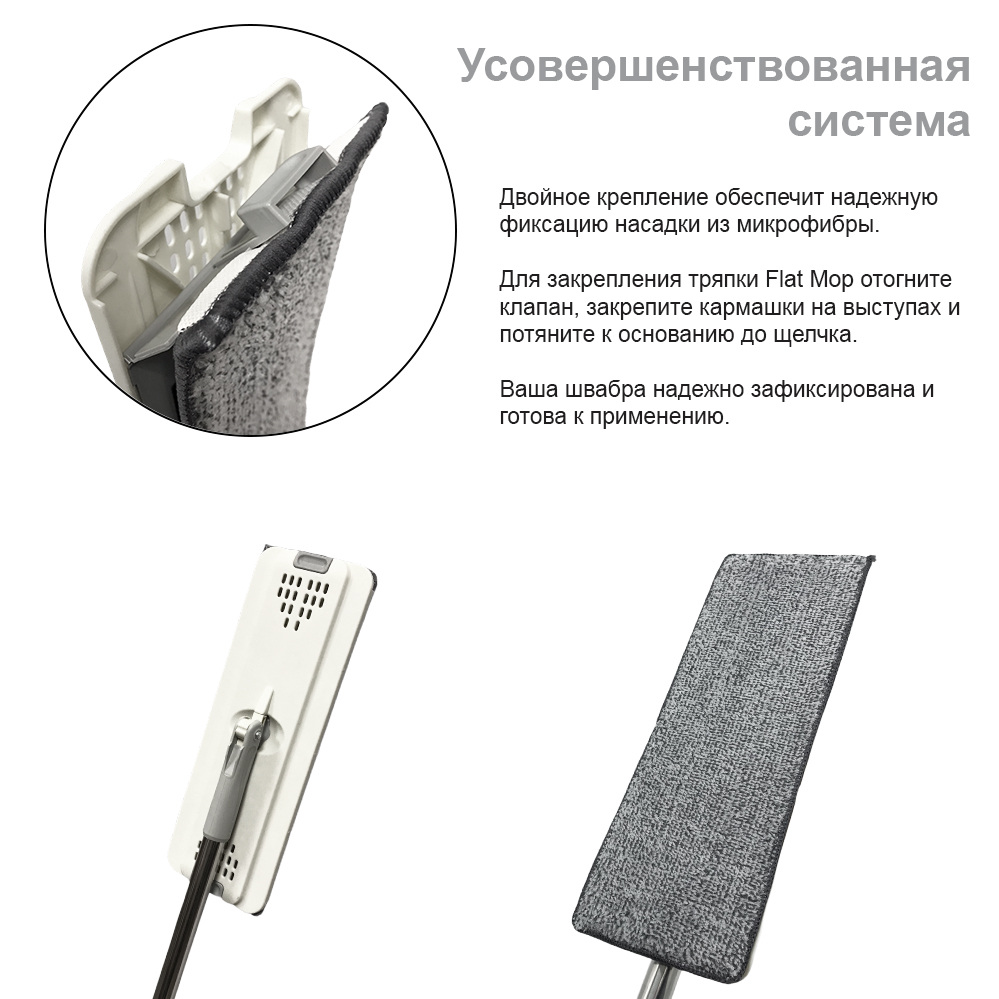 Размеры мопа позволят с легкостью провести уборку больших площадей, любого типа поверхности, в том числе деревянных. Насадка состоит из 100% микрофибры, что позволяет очистить любые загрязнения без применения детергентов.