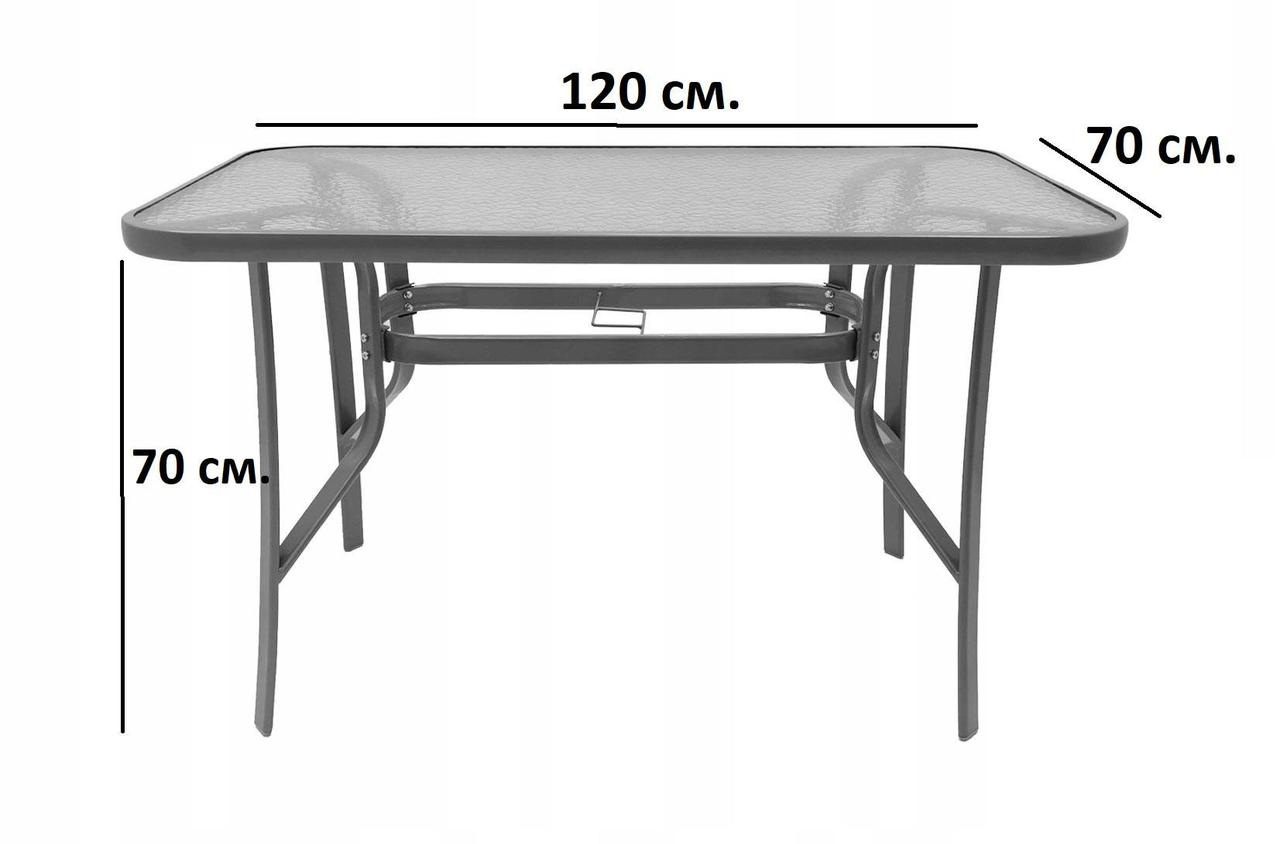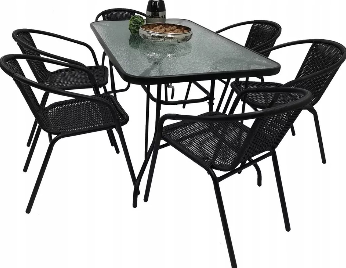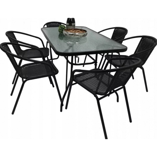 Современные, стильные и долговечные металлическая мебель. Они не требуют сложных процедур ухода или обслуживания, вам нужна только мягкая ткань, вода или жидкость для мытья посуды, чтобы длительное время поддерживать их в хорошем состоянии. В то же время он легкий и простой в хранении. Мебель идеально подходят для отдыха на открытом воздухе, на террасах и в беседках. В комплект входит стол и шесть кресел. Характеристики кресла: - Ширина: 57 см - Глубина: 53 см - Высота: 73 см - Вес: 2,8 кг -Назначение: для внутреннего и наружного применения - Материал: каркас: сталь; сиденье: пластик (пластик, имитирующий ротанг) - Обработка: сталь с порошковым покрытием - Особенности: не регулируется - Уход: не требует обслуживания, легко моется - Инструкции по сборке: сборка не нужна. Характеристики стола: - Столешница из прочного закаленного стекла. -Стальные профили с порошковым покрытием - Подходит для внешнего и внутреннего использования - Легкий сборник - Размер столешницы: 120х70 см -Высота: 70 см.