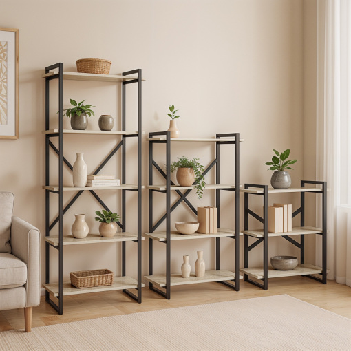 Комплект состоит из трёх отдельных стеллажей разной высоты, которые можно удобно разместить вместе или по отдельности — в зависимости от особенностей помещения.