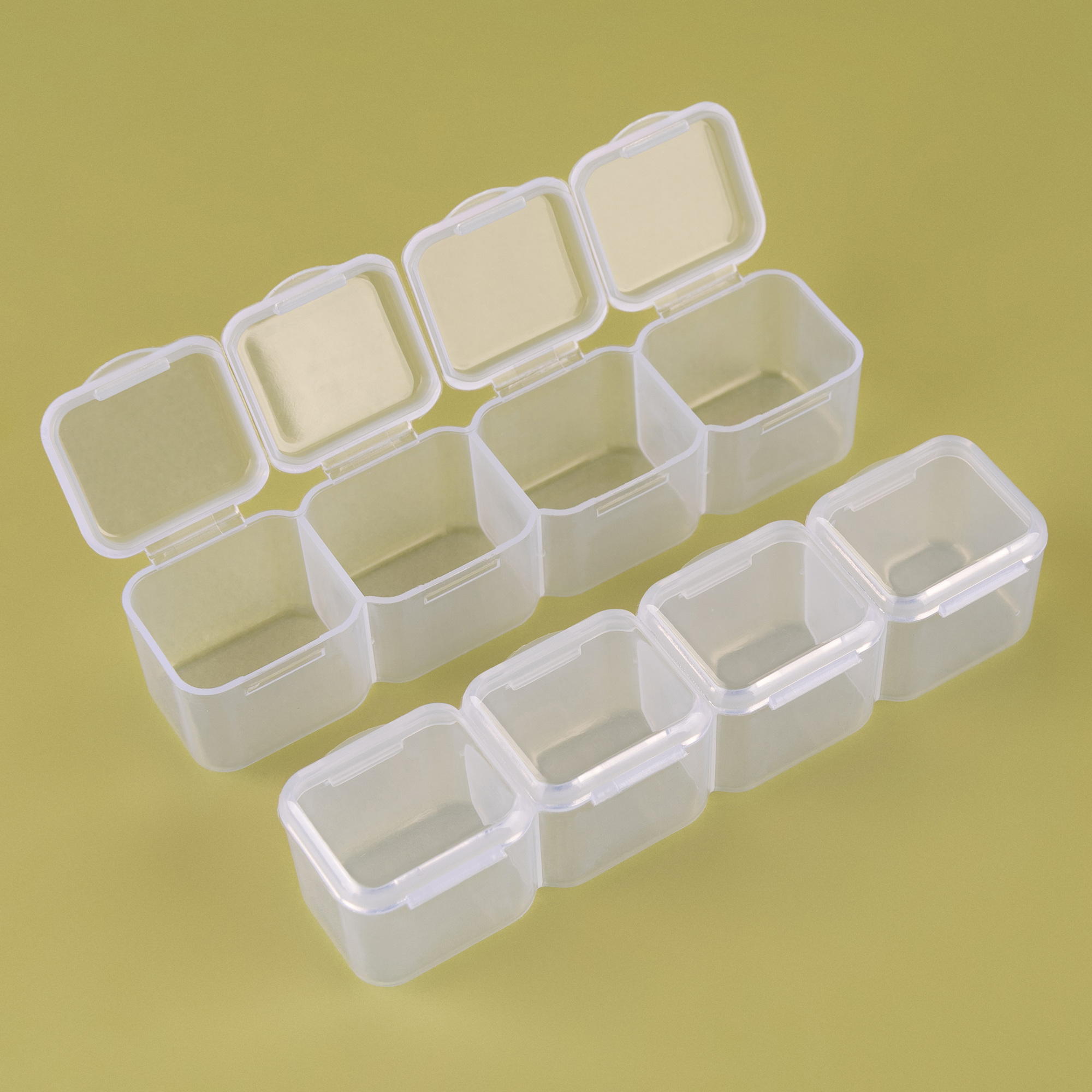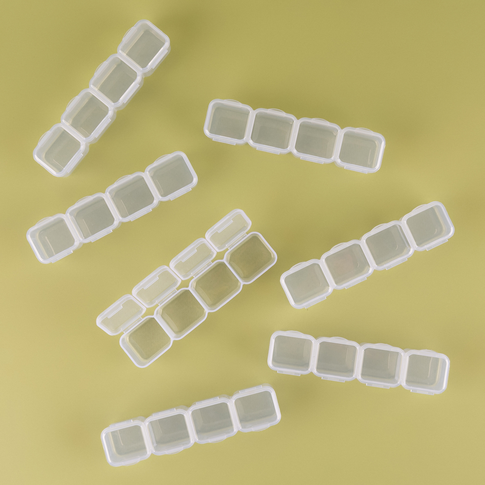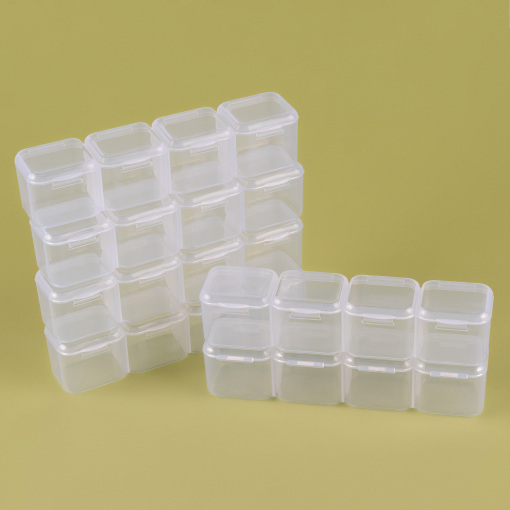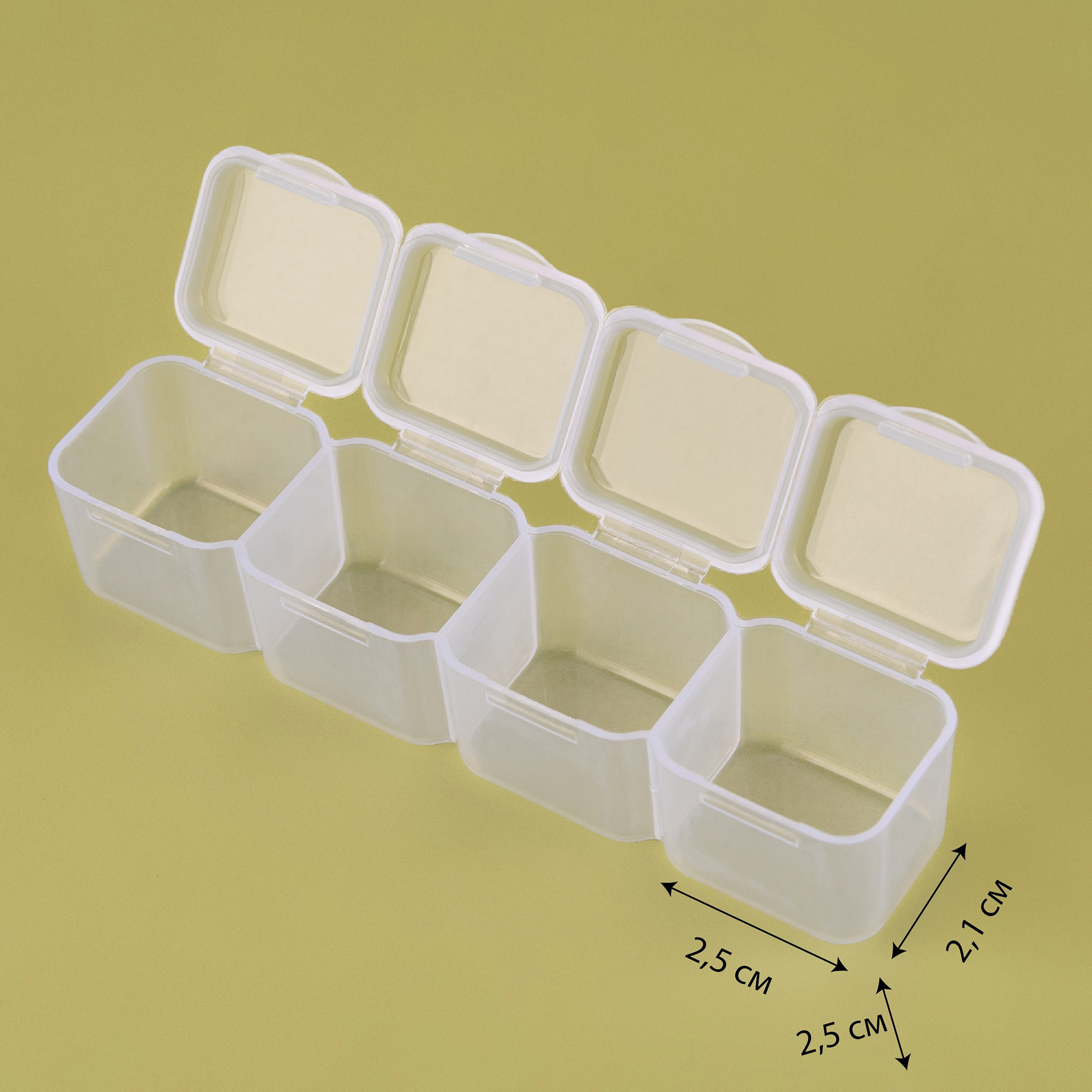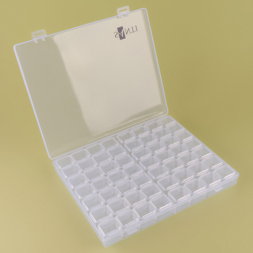 Удобный и практичный пластиковый контейнер для хранения мелкого декора: пайеток, страз, бисера, а также мелкой швейной фурнитуры ( пуговиц, булавок, мелких швейных инструментов и прочих мелочей). Благодаря удобной конструкции контейнера и каждой ячейки, крышка с застежками надежно закрывает органайзер и каждую ячейку и не дает мелким предметам рассыпаться по полу при случайном падении. Размер контейнера: Длина: 21 см Ширина: 17,5 см Высота: 2,6 см Количество ячеек: 56 14 блоков по 4 ячейки с крышечками в боксе.