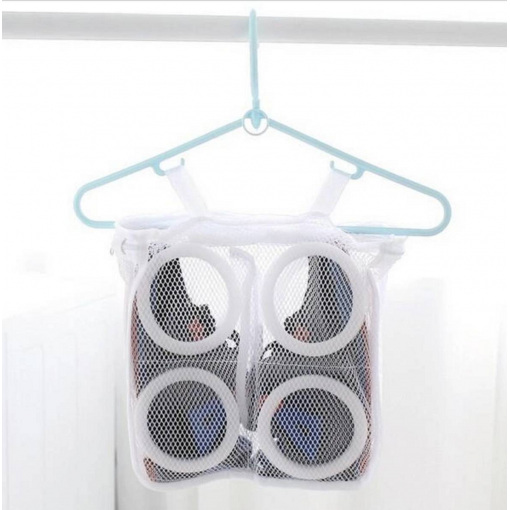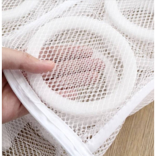 Такой мешочек поможет сберечь не только обувь, но также любимую стиральную машину. Мешок для стирки обуви состоит из двух отсеков, разделенных перегородкой, каждая из которых имеет защитные вставки поролона. Закрывается он молнией. Стирать в таком чехле действительно удобно. Также присутствует ручка для сушки.