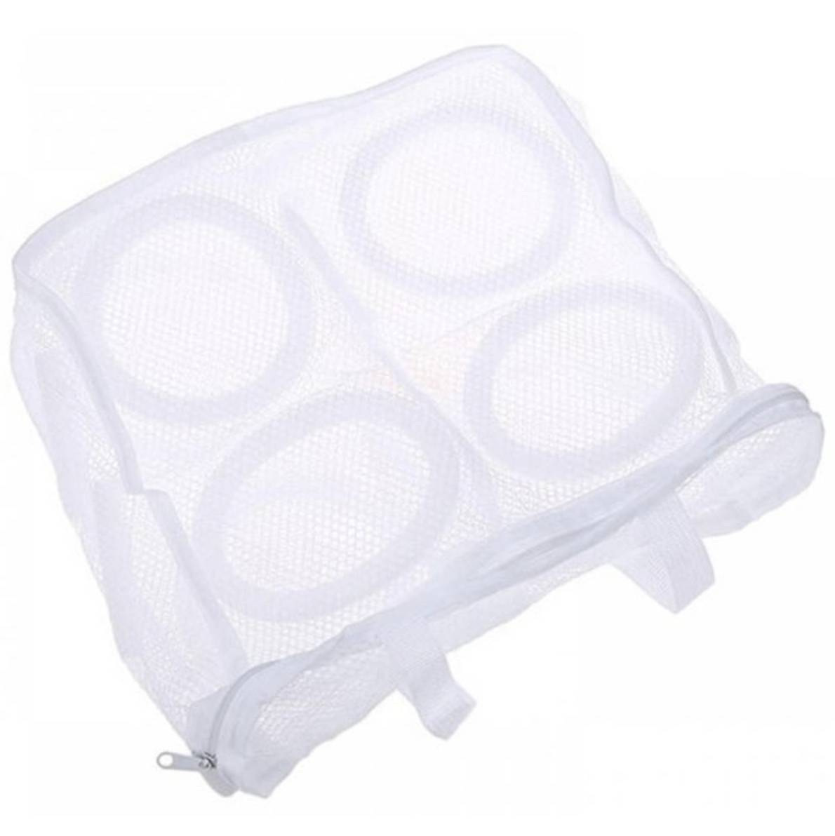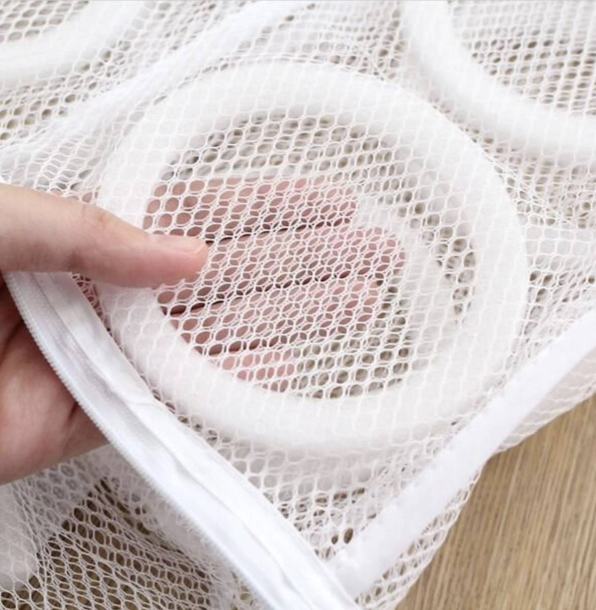 Такой мешочек поможет сберечь не только обувь, но также любимую стиральную машину. Мешок для стирки обуви состоит из двух отсеков, разделенных перегородкой, каждая из которых имеет защитные вставки поролона. Закрывается он молнией. Стирать в таком чехле действительно удобно. Также присутствует ручка для сушки.