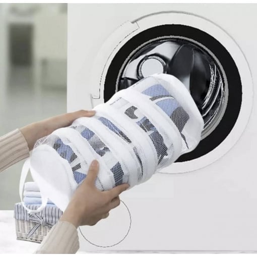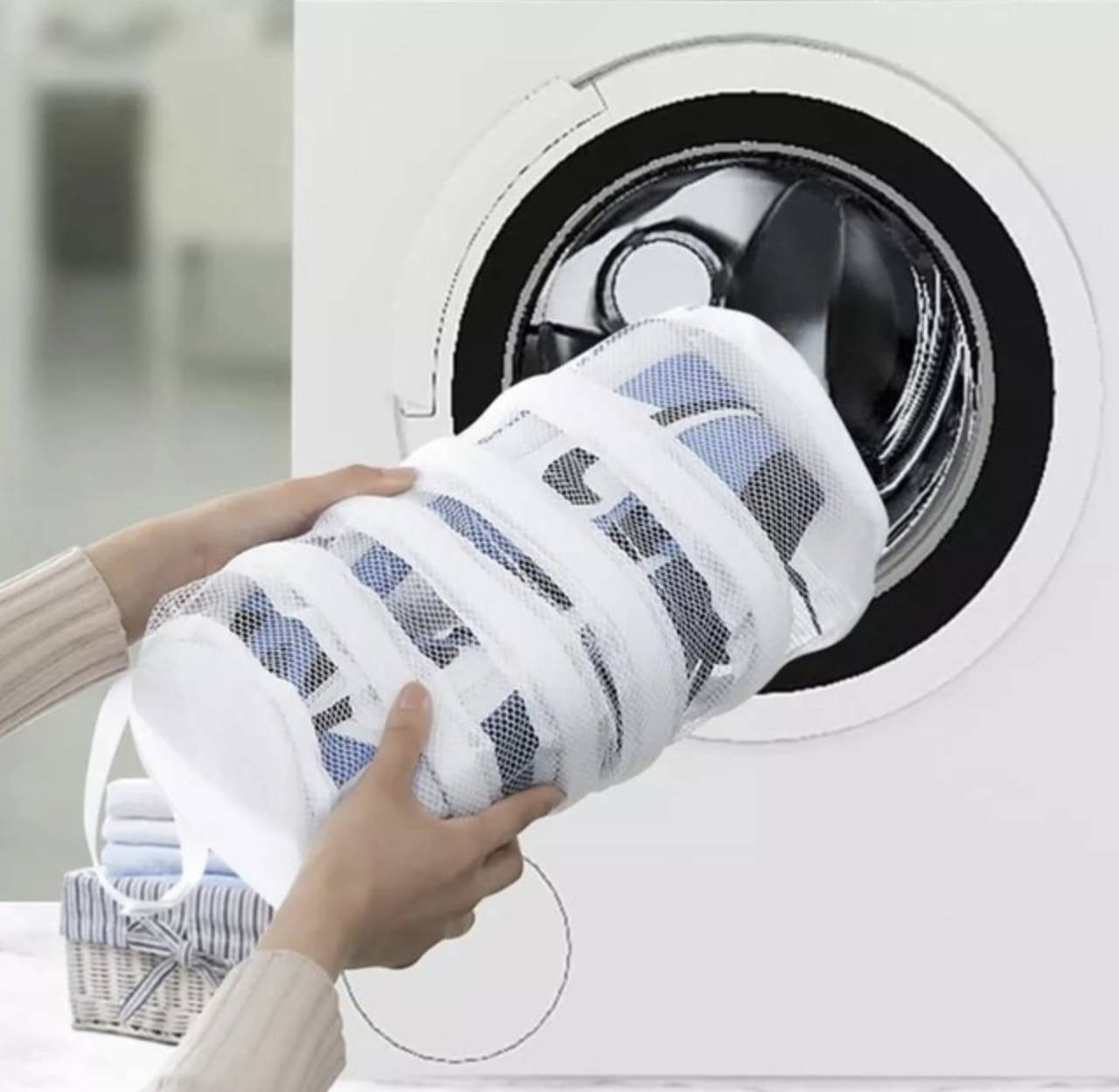 Такой мешочек поможет сберечь не только обувь, но также любимую стиральную машину. Чехол имеет защитные вставки поролона. Закрывается он молнией. Стирать в таком чехле действительно удобно. Также присутствует ручки для сушки.