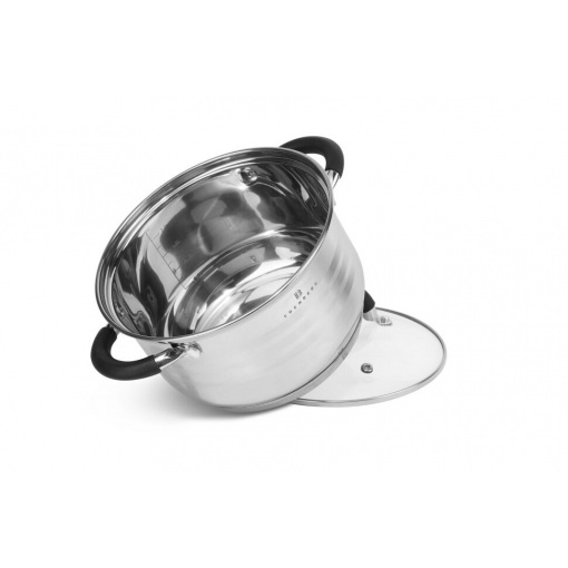 Клепанные ручки из нержавеющей стали с силиконовым прихватом , серебряный цвет. Подходит для всех источников тепла, включая индукционные плиты. Прозрачные крышки – термостойкое стекло с отверстием для выхода пара. Можно мыть в посудомоечной машине. Легко чистится.