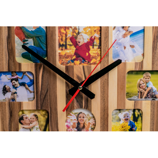 Для того щоб вставити фотографії в годинник, необхідно на тильній стороні виробу повернути пластикові кріплення, вийняти дерев'яні заглушки та вставити фотографії під скло; потім повернути на місце дерев'яні заглушки, ніби притиснувши фотографії до скла, і придавити їх пластиковими кріпленнями на шурупах, повернувши у вихідне положення. Ми зробили цей процес максимально простим – він займає не більше 5 хвилин.