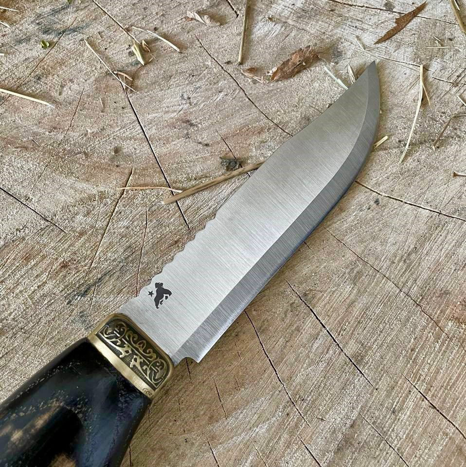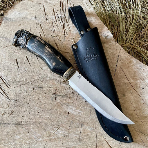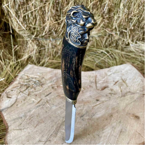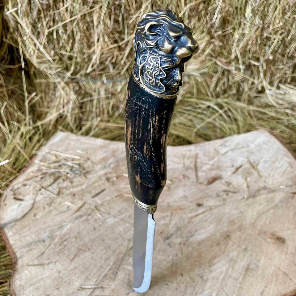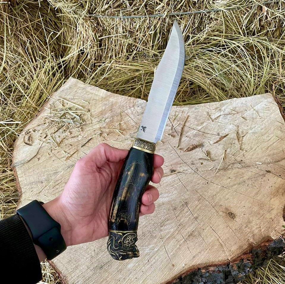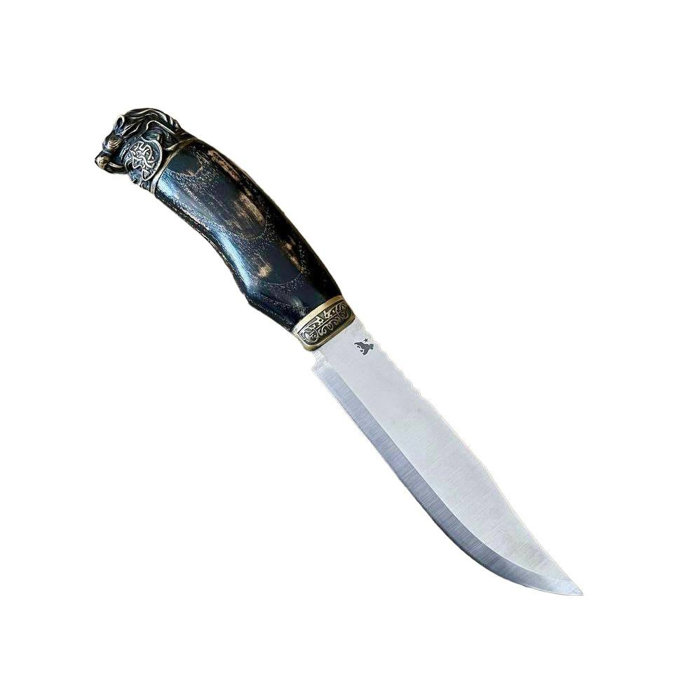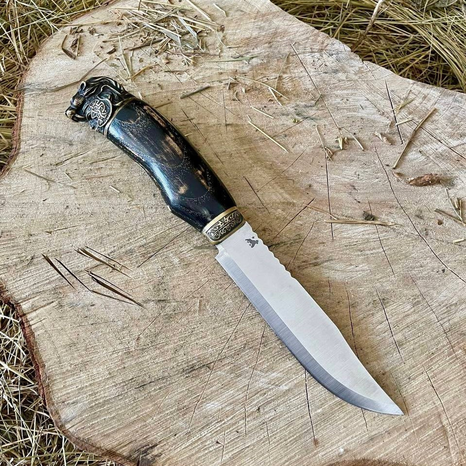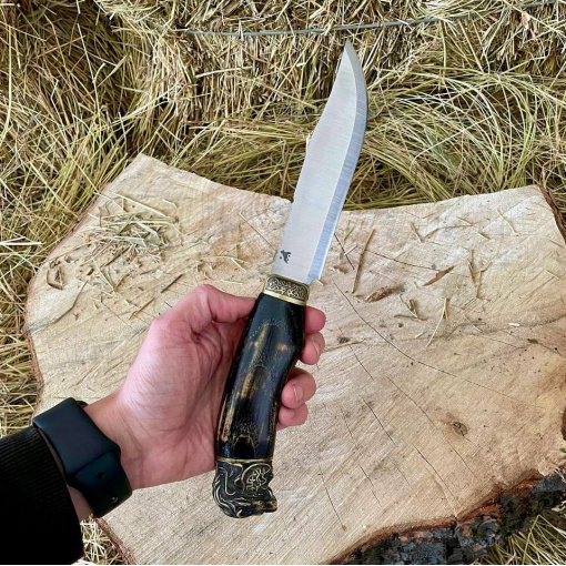 Нож отлично подойдет для любителей охоты, рыбалки и активного отдыха на природе. Рукоятка ножа изготовлена из натурального дерева твердой породы Ясень/Дуб. Украшена художественным литьем из Латуни. Клинок из практичный и надежной, нержавеющей стали 50Х14мф. При небольшой твердости клинок достаточно упругий и износостойкий. Данные ножи имеют твердость 56-58 единиц по Роквеллу. Легко затачиваются и не требуют дополнительного ухода. Кроме этого ножи устойчивы к коррозии. Рукоять пропитана влагостойким маслом. Не боится грязи и влаги. Общая длина ножа - 275 мм Материал клинка - сталь 50Х14мф Длина клинка - 131 мм Ширина клинка - 30 мм Толщина клинка - 3 мм Материал рукояти - Ясень/Дуб Длина рукояти - 144 мм Ширина рукояти - 35 мм Особенности рукояти - гарда литье из Латуни Вес ножа -200 г. *Ножны не входят в стоимость ножа