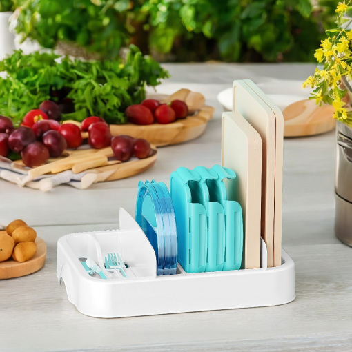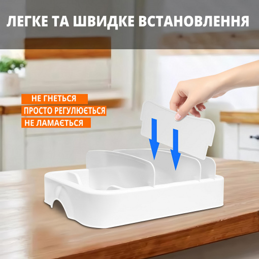 Стопка крышек от контейнеров, которая вечно рассыпается в ящике, бесконечные поиски нужного размера — этот кухонный хаос знаком каждому. Этот органайзер — не просто подставка, а продуманная система, которая превращает беспорядочную груду в идеально организованную "библиотеку" крышек, где у каждой есть свое место. Преимущества Пространство, которое подстраивается под вас Забудьте о фиксированных ячейках. Пять регулируемых разделителей можно легко перемещать, создавая отсеки идеальной ширины для любой крышки — от маленькой круглой до большой прямоугольной. Наконец-то вы можете настроить хранение идеально под свою коллекцию посуды. Надежная фиксация без падений Больше никаких соскальзывающих стопок. Высокие разделители надежно удерживают крышки в вертикальном положении, предотвращая их падение и смешивание. А специальный канал на дне органайзера не дает круглым крышкам скатываться, обеспечивая идеальную стабильность. Все на виду, все под рукой Вертикальное хранение — это гениально просто. Вы видите все крышки сразу и можете легко взять нужную, не перерывая всю стопку. Это значительно экономит ваше время и нервы во время готовки или сбора обеда с собой. Продуманный дизайн для удобства Встроенные ручки по бокам позволяют легко достать весь органайзер из глубокого ящика или с высокой полки, чтобы выбрать крышку или переставить его в другое место. Установка не требует никаких инструментов и занимает меньше минуты. Универсальный солдат порядка Этот органайзер идеален не только для крышек. Используйте его для хранения разделочных досок, плоских тарелок, форм для выпечки, папок с документами или даже для организации детских книг и планшетов. Это не просто органайзер, а ваш личный помощник в создании идеального порядка на кухне. Он избавляет от ежедневного раздражения, экономит ваше время и превращает проблемный ящик в образец организации и эффективности. Характеристики Тип: Органайзер для крышек Материал: ABS-пластик (BPA-free) Цвет: Белый Размер: 27 х 19 х 12 см Количество разделителей: 5 шт. Особенности: Регулируемые разделители, встроенные ручки