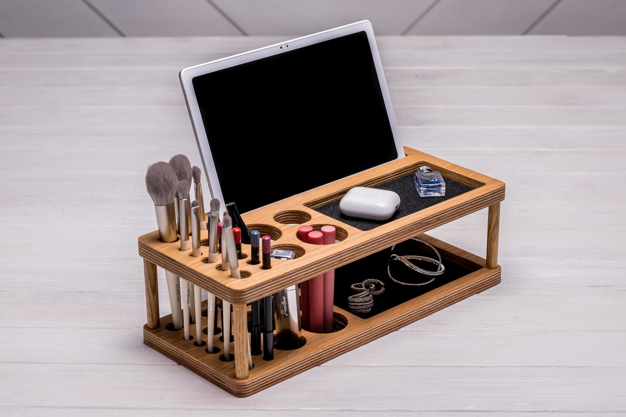 Органайзер для косметики - це корисна та стильна річ, за допомогою якої дівчата всього світу зберігають своє косметичне приладдя для створення краси. Незліченна кількість баночок, тюбиків і мініатюрних пензликів - все має мешкати в надійному затишному містечку, де дитина чи кішечка нічого точно не дістане і, водночас, усе лежатиме на своєму місці. До того ж із огляду на ритм сучасного життя необхідно мати все необхідне прямо під рукою. Ми впевнені – Ви помістите туди абсолютно все, що Вам заманеться. Використання паза для планшета дозволить не лише використовувати гаджет як дзеркало, а й оперативно ділитися Вашою посмішкою у Instagram.