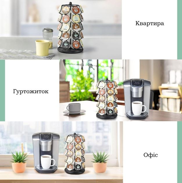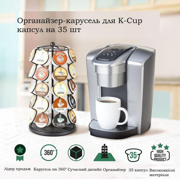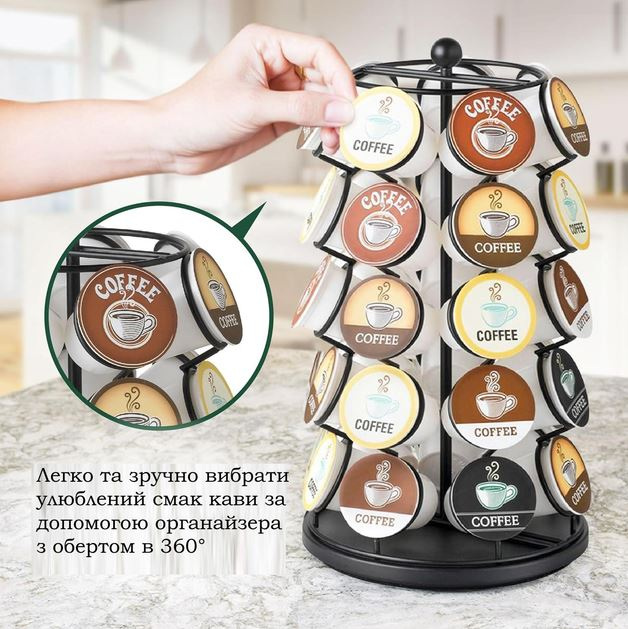 Органайзер-карусель для капсул K-Cup — это воплощение компактности, удобства и стиля в каждой детали. Эта вертикальная подставка позволяет удобно хранить до 35 капсул K-Cup, обеспечивая быстрый доступ к вашим любимым вкусам кофе. Оборудованная надежным поворотным основанием Lazy Susan, карусель вращается на 360°, что делает поиск нужной капсулы максимально простым и комфортным.