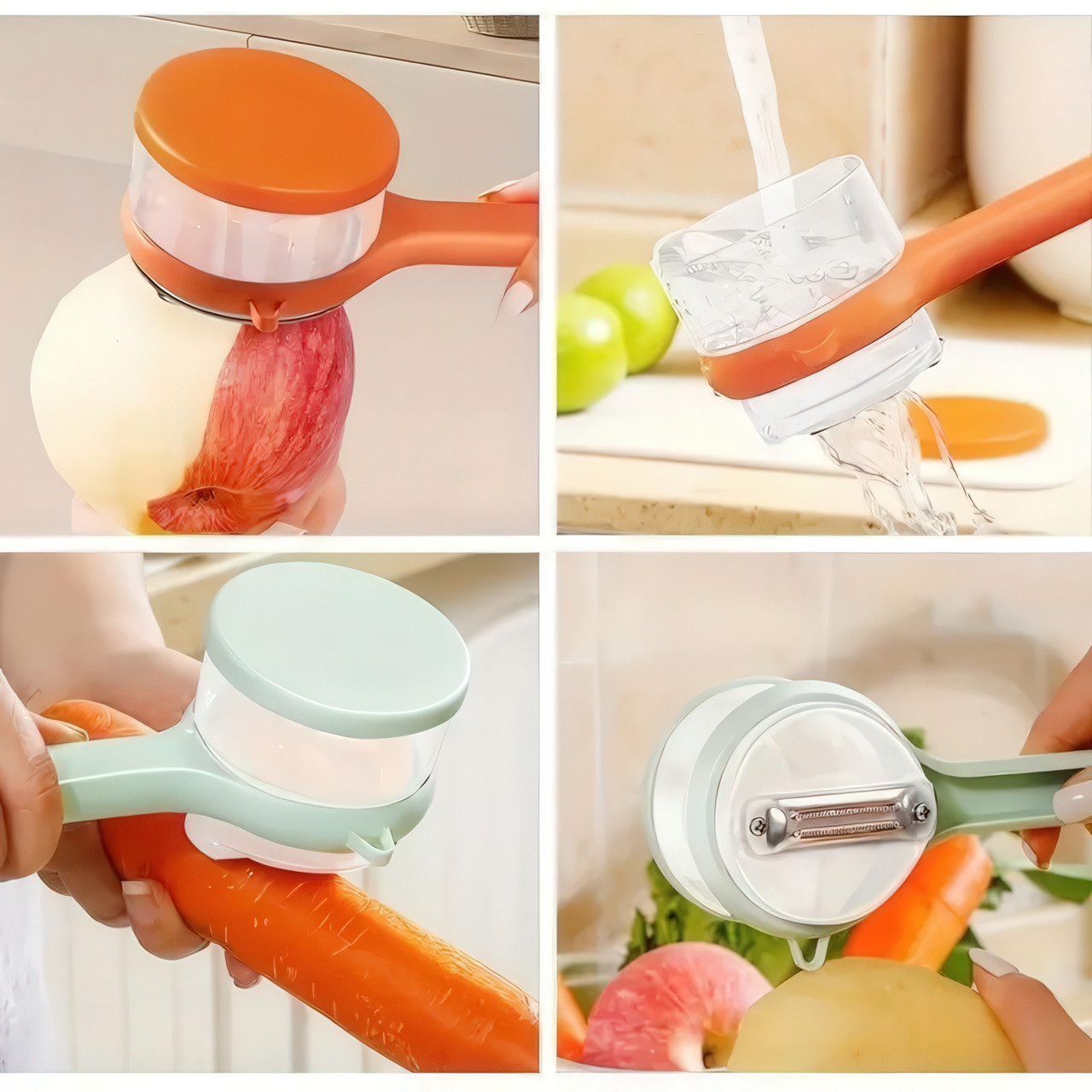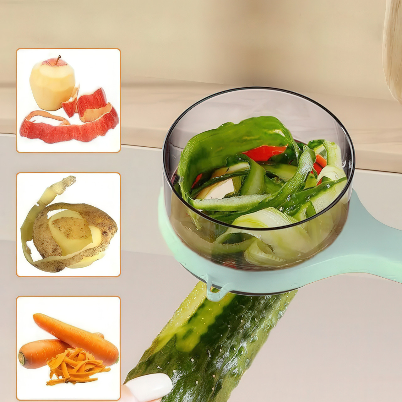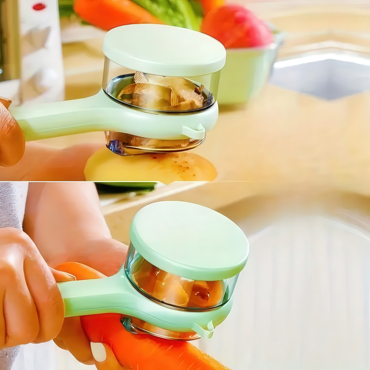 Чистка овощей — это всегда маленький беспорядок: кожура летит на стол и на пол, а под рукой постоянно нужна миска для отходов. Этот инновационный инструмент создан для того, чтобы раз и навсегда изменить правила игры, объединяя в себе эффективность и идеальную чистоту. Преимущества Кухня без единой соринки Это главное волшебство этой овощечистки. Прозрачный контейнер, интегрированный в корпус, мгновенно собирает всю срезанную кожуру. Больше никаких разбросанных очистков и необходимости держать мусорное ведро под рукой. Ваша рабочая поверхность остается идеально чистой от начала и до конца. Идеально тонкая кожура Острое, как бритва, лезвие из высококачественной нержавеющей стали плавно скользит по поверхности, снимая только тончайший слой кожуры. Вы сохраняете максимум витаминов и ценной мякоти, сокращая количество отходов. Лезвие не тупится и не требует заточки. Комфорт и полный контроль Эргономичная рукоятка с нескользящим покрытием идеально ложится в руку, обеспечивая уверенный хват и снижая усталость при обработке большого количества овощей. Вы полностью контролируете каждое движение, делая процесс быстрым и безопасным. Продуманность в деталях Помимо основной функции, на боковой части инструмента есть специальная петелька-нож для быстрого и аккуратного удаления "глазков" у картофеля и других дефектов. А после использования контейнер легко отсоединяется для быстрой очистки. Это не просто овощечистка, а умный гаджет для современной кухни, который экономит ваше время на уборке и делает процесс приготовления пищи более организованным и приятным. Настоящая находка для тех, кто ценит чистоту и продуманные решения в быту. Характеристики Тип: Овощечистка с контейнером Материал лезвия: Нержавеющая сталь Материал корпуса: ABS-пластик Цвет: Светло-зеленый Особенности: Встроенный контейнер для очистков, нож для удаления глазков