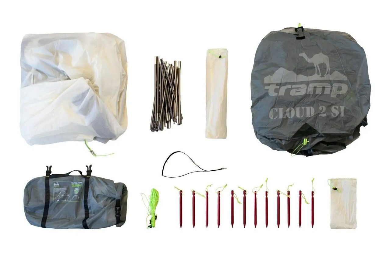 Ультралегкая трехместная туристическая палатка хабовой конструкции Tramp Cloud 3 Si из силиконизированного Rip-Stop нейлона, чистый вес котрой (без колышков и оттяжек) всего 2270 гр. Свободностоящая хабовая конструкция каркаса обеспечивает очень быструю, простую , интуитивно понятную установку, больший, по сравнению с палатками других конструкций, жилой объем спального отсека и повышенную ветроустойчивость. Хабовая конструкция каркаса палатки (HUB) – это когда все дуги соединены одним коннектором (хабом), который объединяет весь каркас палатки в одно целое. Дуги не смещаются одна относительно другой и палатка хорошо держит форму, ее практически невозможно установить криво или с перекосом. Дополнительная консольная короткая тамбурная дуга увеличивает объем и высоту тамбуров и придает палатке более ветрообтекаемую форму. Внутренняя палатка практически полностью выполнена из сетки благодаря чему палатка прекрасно вентилируется, в ней практически не скапливается конденсат, и вам будет комфортно даже жаркой летней ночью. Палатка пошита из прочного, усиленного Rip-Stop плетением и пропитанного силиконом нейлона с высокой водонепроницаемостью. Благодаря светло серому цвету тент будет значительно меньше выгорать на солнце, и дольше прослужит если вы часто путешествете летом или в жарких странах. Назначение: пешие и горные походы, fast&light туризм, велопоходы и мотопоездки, путешествия автостопом или low cost перелетами , рыбалка, охота и отдых у моря. Время использования : весна – лето – осень Особенности: ультралегкая силиконизированная ткань нейлон Rip-Stop конструкция HUB с консолью двухслойная с 2 входами и 2 тамбурами для комфортного совместного использования все швы проклеены два вентиляционных клапана внешний тент имеет пропитку, задерживающую распространение огня светоотражающие оттяжки и элементы на вентиляции у комплектована 3-х гранными колышками яркого цвета в комплекте съемная полочка при необходтимости к палатке можно докупить дополнительный пол (Footprint) для большей защиты дна палатки Характеристики : Вместимость: 3 человека Полный вес: 2270 г. Конструкция: HUB с консолью Входы и тамбура: 2 входа и 2 тамбура Каркас: авиационный алюминий 7071 8,5 мм Тент: 4000 мм. в. ст. 100% нейлон 15D nylone coated silicone Дно: 4000 мм. в. ст. 100% нейлон 15D nylone coated silicone Цвет: светло серый Внутренняя палатка: дышащий полиэстер Размер: 310 х 220 х 105 см Габариты в упаковке: 45 х 17 х 15 см.