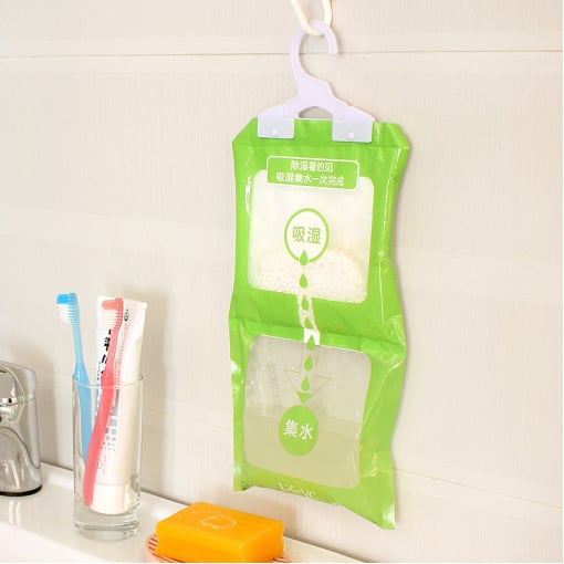 Поглотитель влаги – инновационное устройство, которое эффективно устраняет проблему повышенной влажности в любом помещении с помощью абсорбирующих гранул. Представляет собой небольшой пластиковый мешочек, разделённый на два яруса. В верхней части размещены влагопоглощающие гранулы, состоящие из активных кристаллов и активированного угля. Нижний ярус пакета полый (пустой). Гранулы впитывают влагу из воздуха и набухают. Когда накопившаяся влага будет переизбыточна, то вода станет постепенно стекать в резервуар, расположенный в нижней части мешочка. Можно размещать в шкафу или на окнах при конденсации, в ванной комнате и т.п. Отсутствие электрического шнура делает прибор предельно мобильным. Борется с образованием влаги, плесневых запахов, с конденсацией и т.п. Размер контейнера: 30см х 16cм, длина вешалки: 7см. Вес: 300г.Срок действия: по мере наполнения нижнего резервуара. Поглощает до 450мл влаги. Прочность крючка рассчитана на вес упаковки, заполненной водой. Одноразового использования.