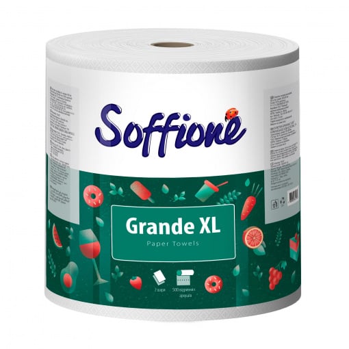 Полотенца бумажные Soffioe "Grade XL" двухслойные . Расцветка: белая. Размер листа: 22х23 см. Количество листов в рулоне: 500. 100 процентов целлюлоза.