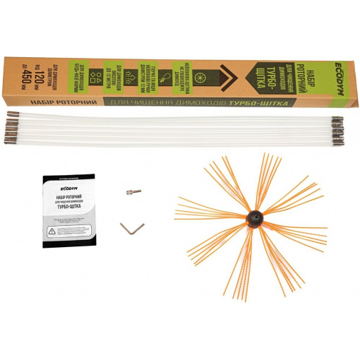 Роторный набор для чистки дымоходов Ecodym Турбо-Щетка (1 м x 6 шт) подходит как для профессионального, так и домашнего использования. Это простой способ очистки дымохода от сажи с помощью электрической дрели или шуруповерта. Благодаря данному набору можно самостоятельно удалить сажу и пепел из внутренних стен дымоходных элементов без их повреждения.