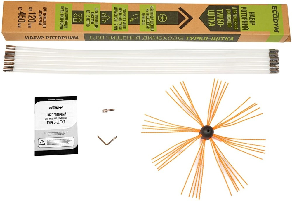 Роторный набор для чистки дымоходов Ecodym Турбо-Щетка (1 м x 8 шт) подходит как для профессионального, так и для домашнего использования. Это простой способ очистки дымохода от сажи с помощью электрической дрели или шуруповерта. Благодаря данному набору можно самостоятельно удалить сажу и пепел из внутренних стен дымоходных элементов без их повреждения.