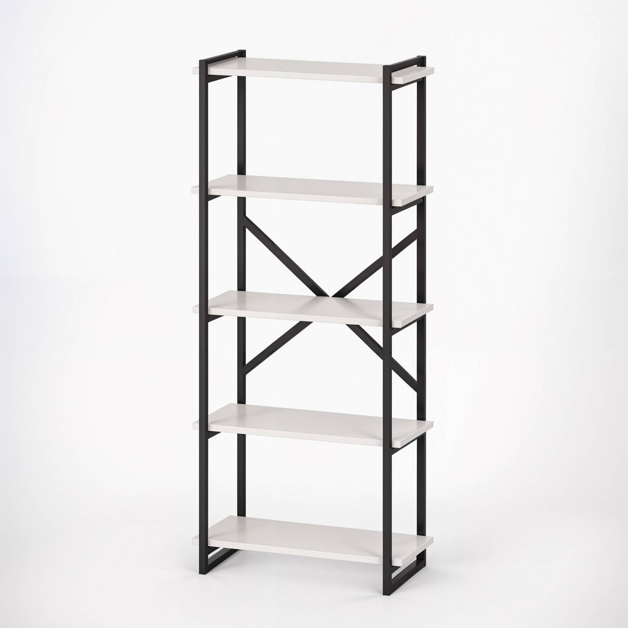 Прочный металлический каркас, усиленный крестовиной, обеспечивает устойчивость и надёжность. Пять открытых полок позволяют удобно размещать книги, элементы декора, коробки или другие вещи без ощущения загромождённости.