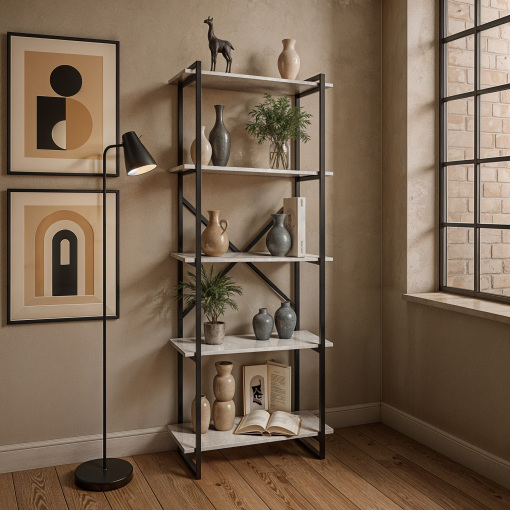Прочный металлический каркас, усиленный крестовиной, обеспечивает устойчивость и надёжность. Пять открытых полок позволяют удобно размещать книги, элементы декора, коробки или другие вещи без ощущения загромождённости.