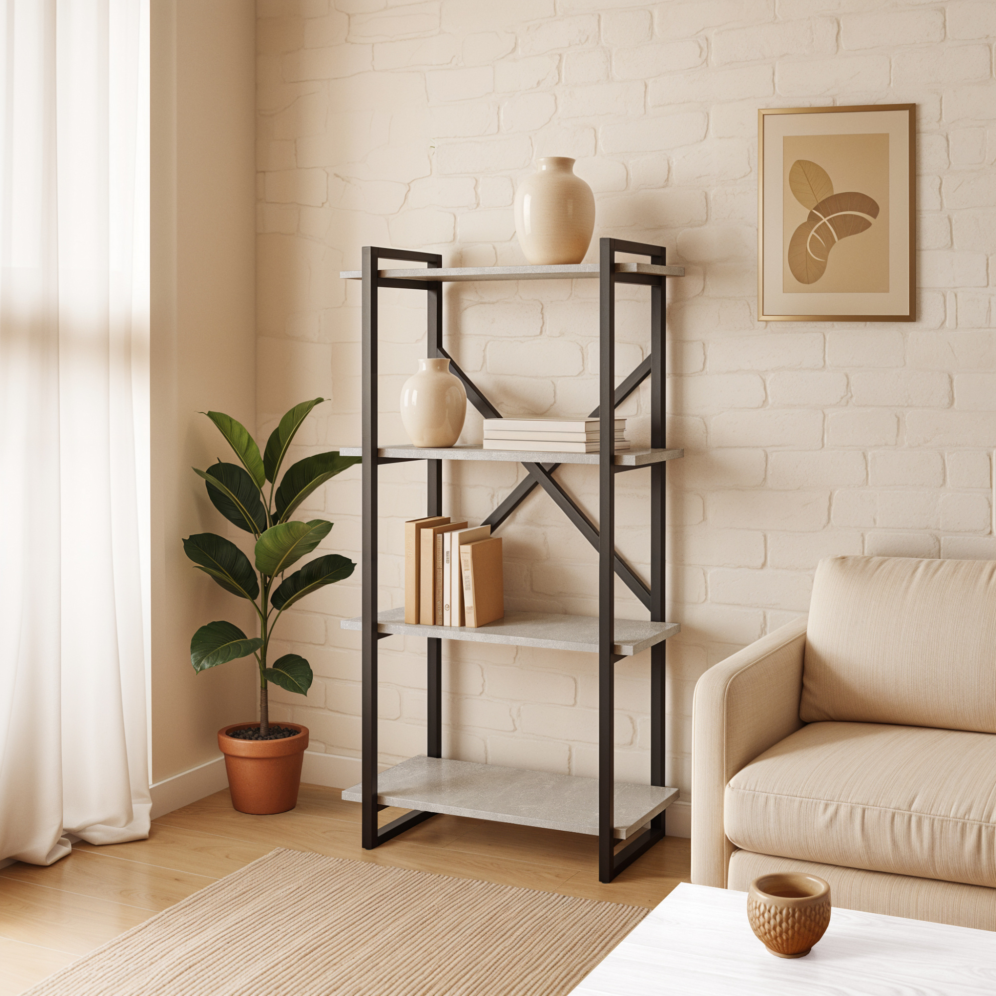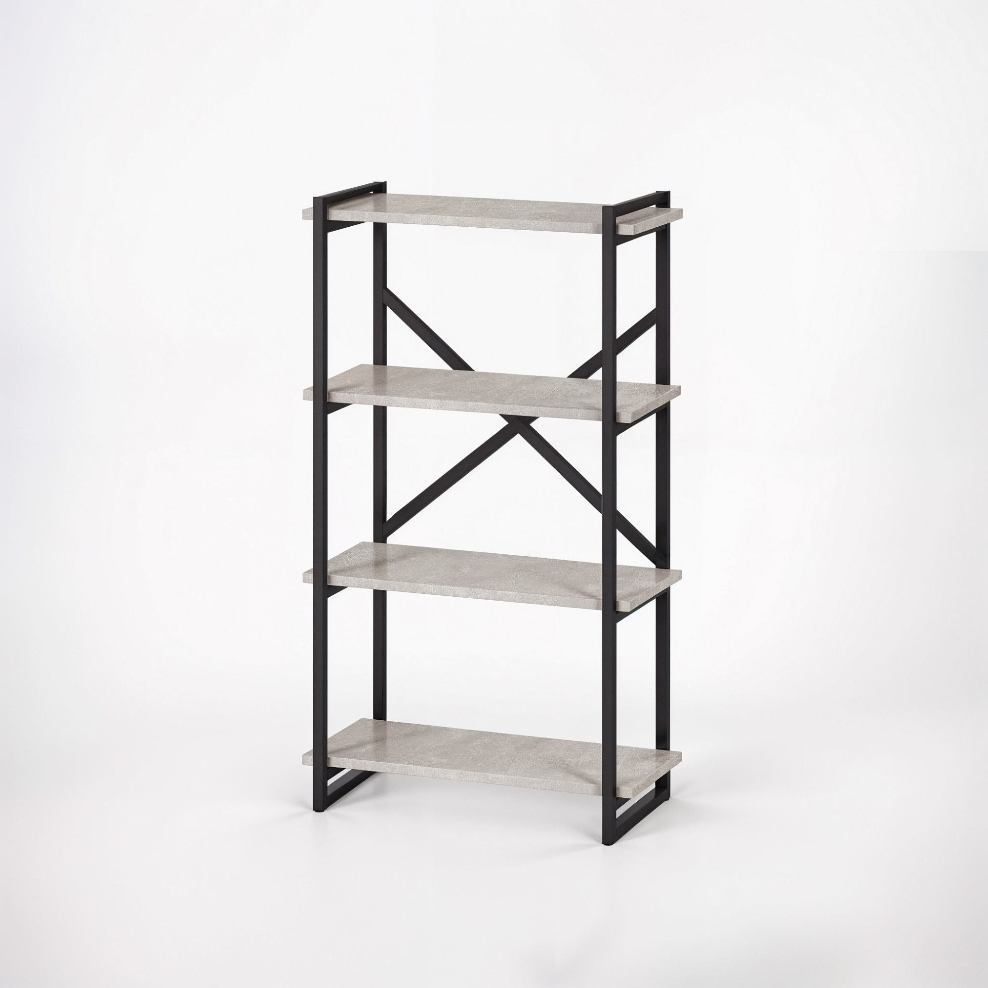 Прочный металлический каркас, усиленный крестовиной, обеспечивает устойчивость и надёжность. Открытые полки позволяют удобно размещать книги, элементы декора, коробки или другие вещи без ощущения загромождённости.
