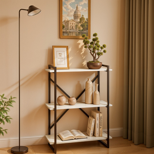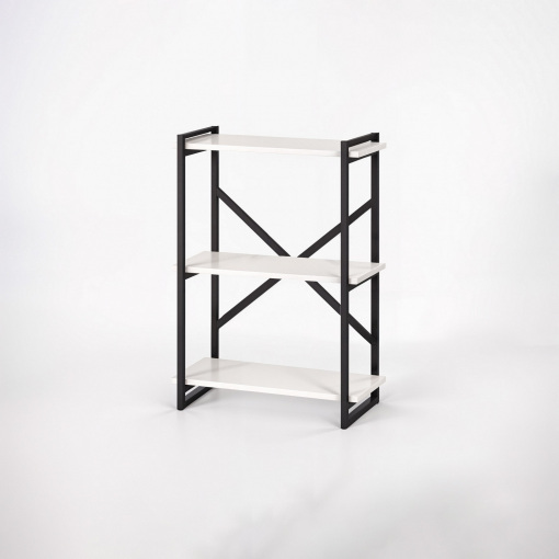 Прочный металлический каркас, усиленный крестовиной, обеспечивает устойчивость и надёжность. Открытые полки позволяют удобно размещать книги, элементы декора, коробки или другие вещи без ощущения загромождённости.