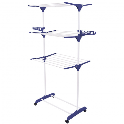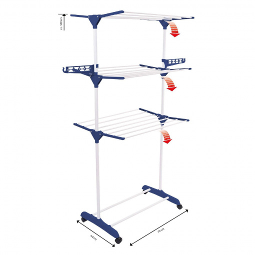 Боковые крылья сушилки складываются вниз, если в них нет необходимости, таким образом на верхних крыльях сушилки можно сушить белье длиной более 3-х метров. Полная рабочая поверхность составляет 16 метров, чего хватает для сушки белья после одного с половиной цикла стирки стандартной пятикилограммовой стиральной машинки. Несмотря на то, что сушилка поставляется в разобранном виде, процесс сборки занимает не более 15 минут благодаря тому, что все элементы промаркированы согласно подробной инструкции, поставляемой в комплекте.