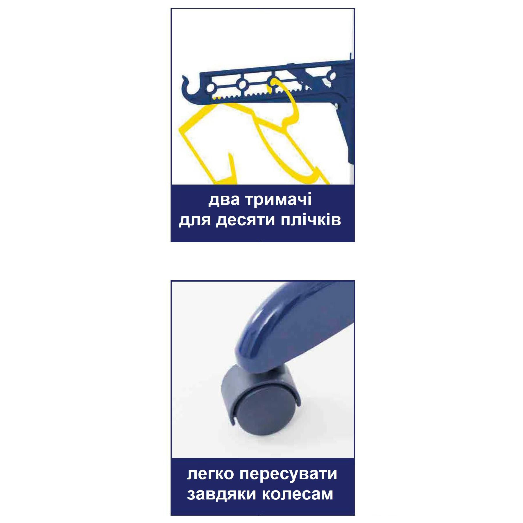 • Две боковые пластиковые консоли позволяют сушить одежду длиной до 140 см на плечиках (тремпелях). Консоли снимаются, или складываются внутрь сушилки, когда в них нет необходимости.