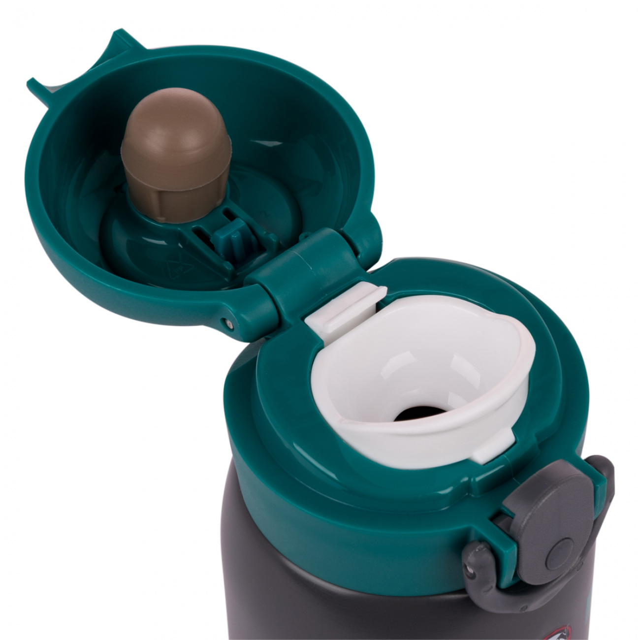 Откидная крышка удобно открывается одной рукой с помощью кнопки, а дополнительный фиксатор предотвращает протекание. Обладает силиконовыми элементами, обеспечивающими герметичность.