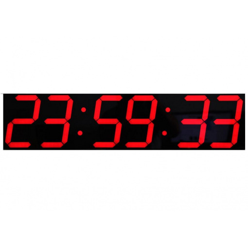 Великий настінний LED годинник в чорному корпусі з червоними цифрами. Показує час у форматі години/хвилини/секунди.